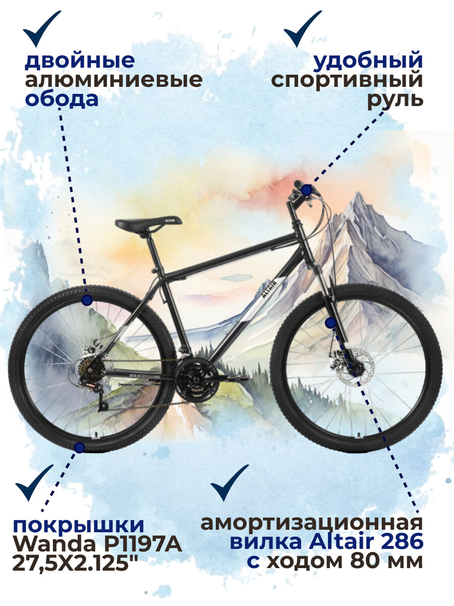 Велосипед ALTAIR MTB HT 2.0 D 27,5" (2022) (Велосипед ALTAIR MTB HT 27,5 2.0 D (27,5" 21 ск. рост. 17") 2022, черный/серебристый, RBK22AL27138) 18 200 ₽