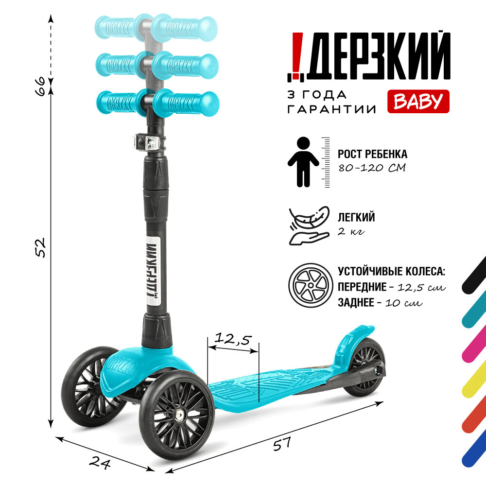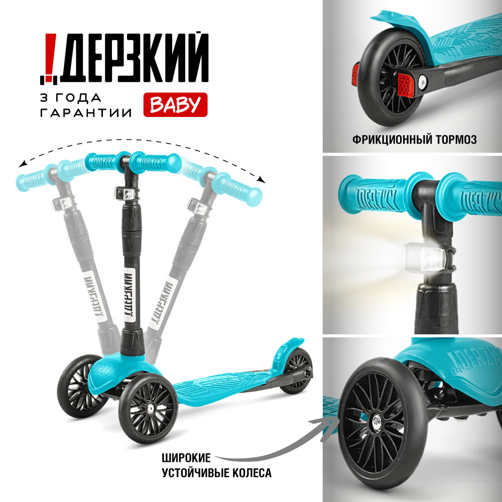 !Дерзкий Самокат детский трехколесный 0-5 лет ! Дерзкий BABY Старт бесшумное шасси Super CHASSIS 3-колесный 3 года гарантии, бирюзовый