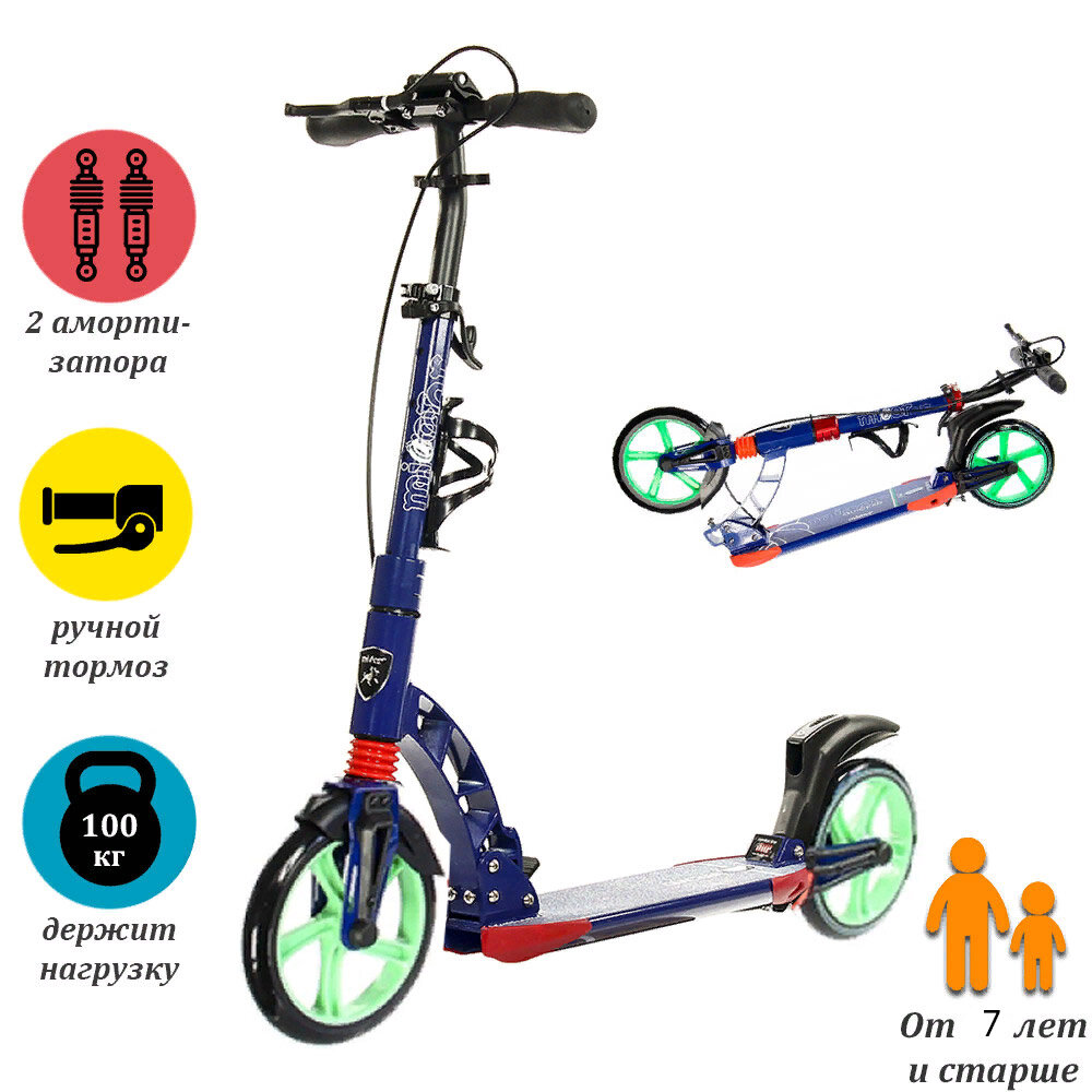 Двухколёсный городской самокат Micar Quicker 230 сине-зеленый с ручным тормозом и амортизаторами информация: