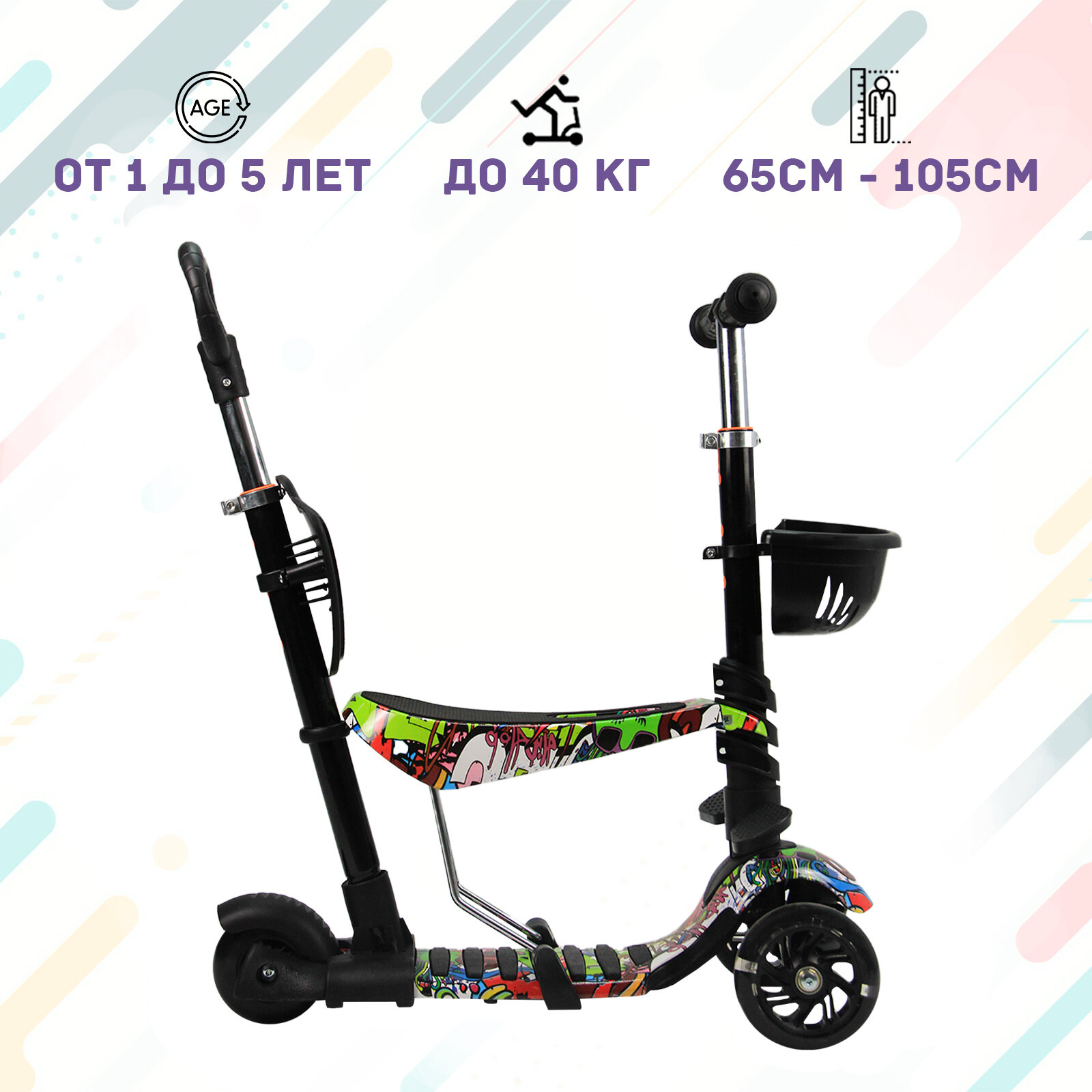 Отзывы на Самокат детский трехколесный 3 в 1 до 5 лет со светящимися колесами, 110 мм, Фиолетовое граффити
