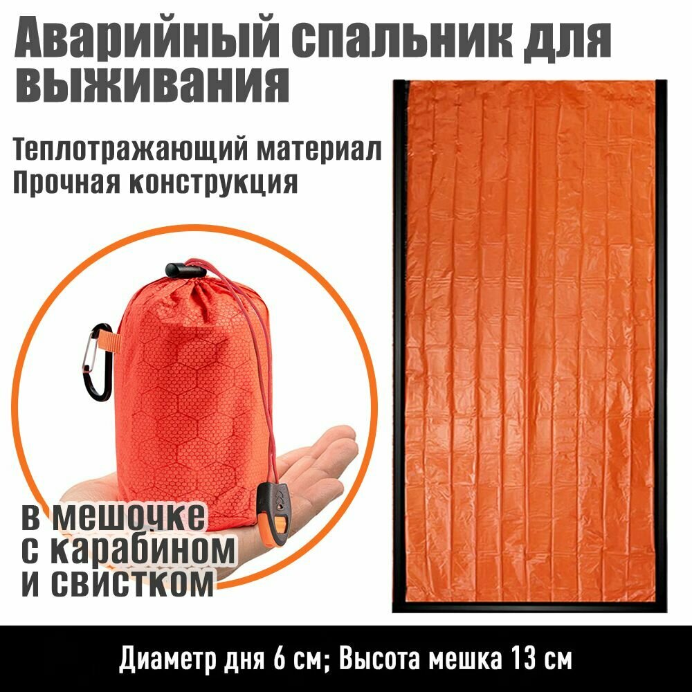 Аварийный спальный мешок с карабином и свистком оранжевый, спасательный спальный мешок туристический в мешочке информация: