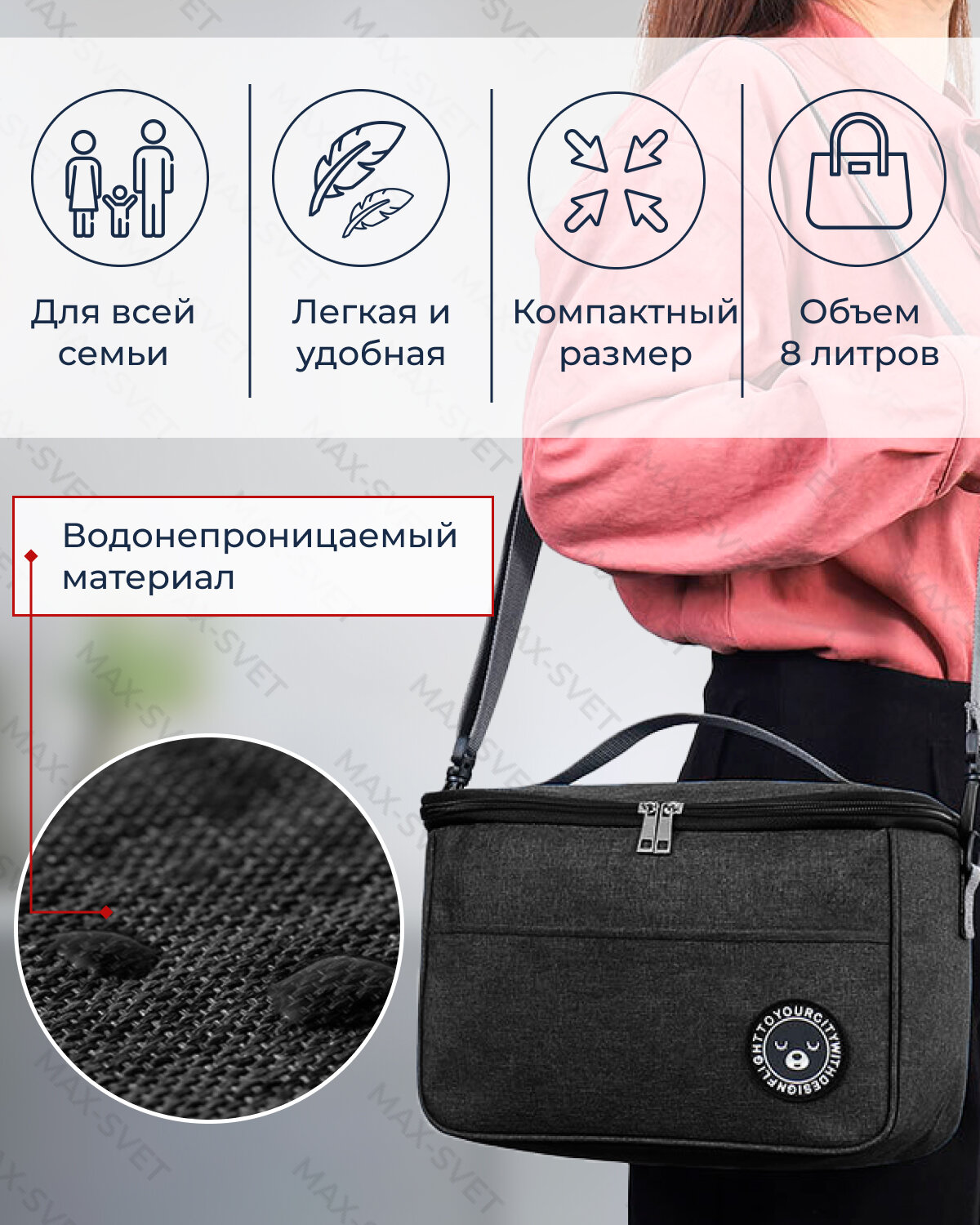 Сумка холодильник S-MAX объемом 8 литров со съемным плечевым ремнем, водонепроницаемыми швами для сохранения продуктов в тепле или холоде, черная информация: