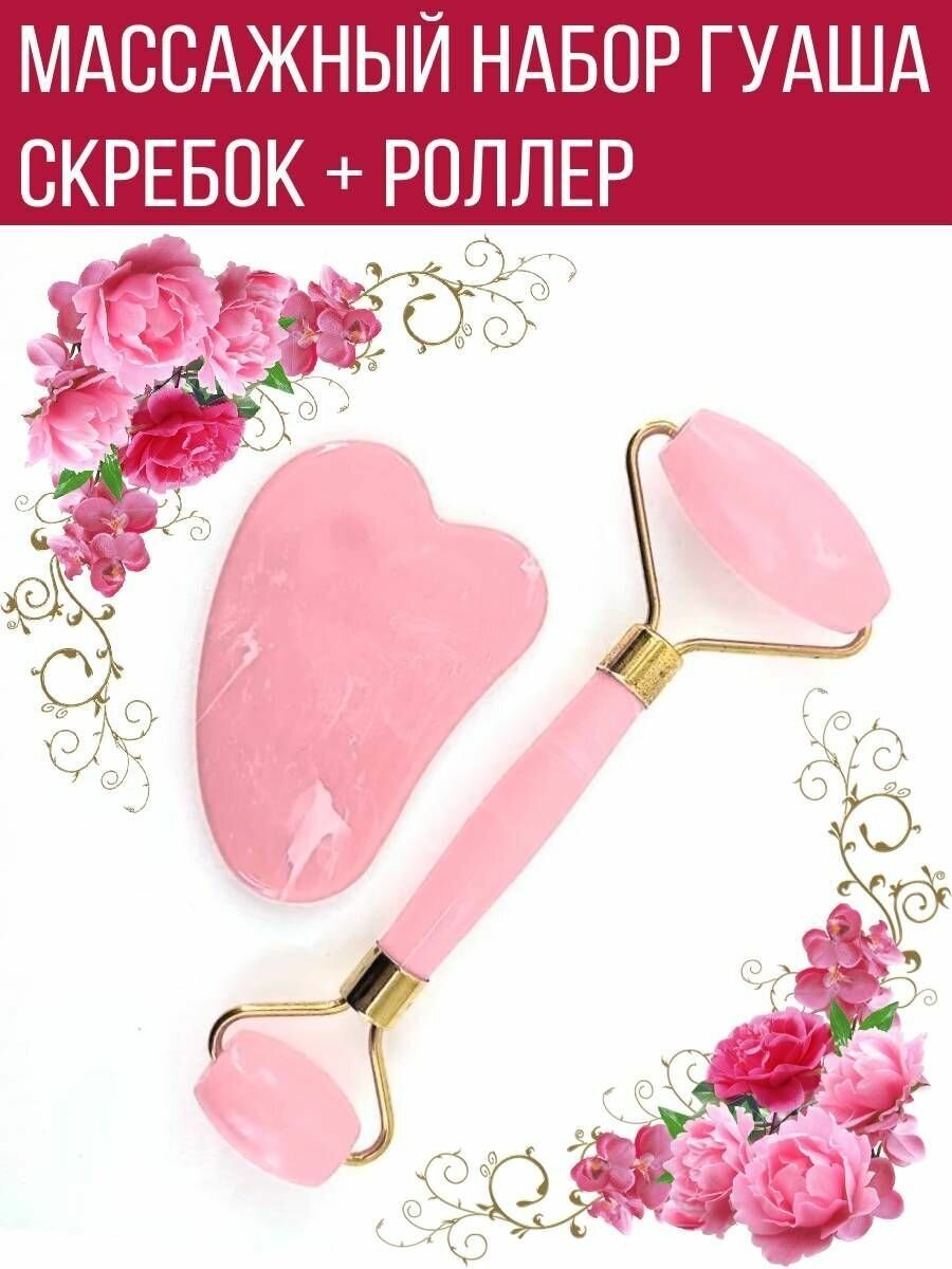 Массажный набор гуаша для лица, скребок, роллер, пластик, светло-розовый информация: