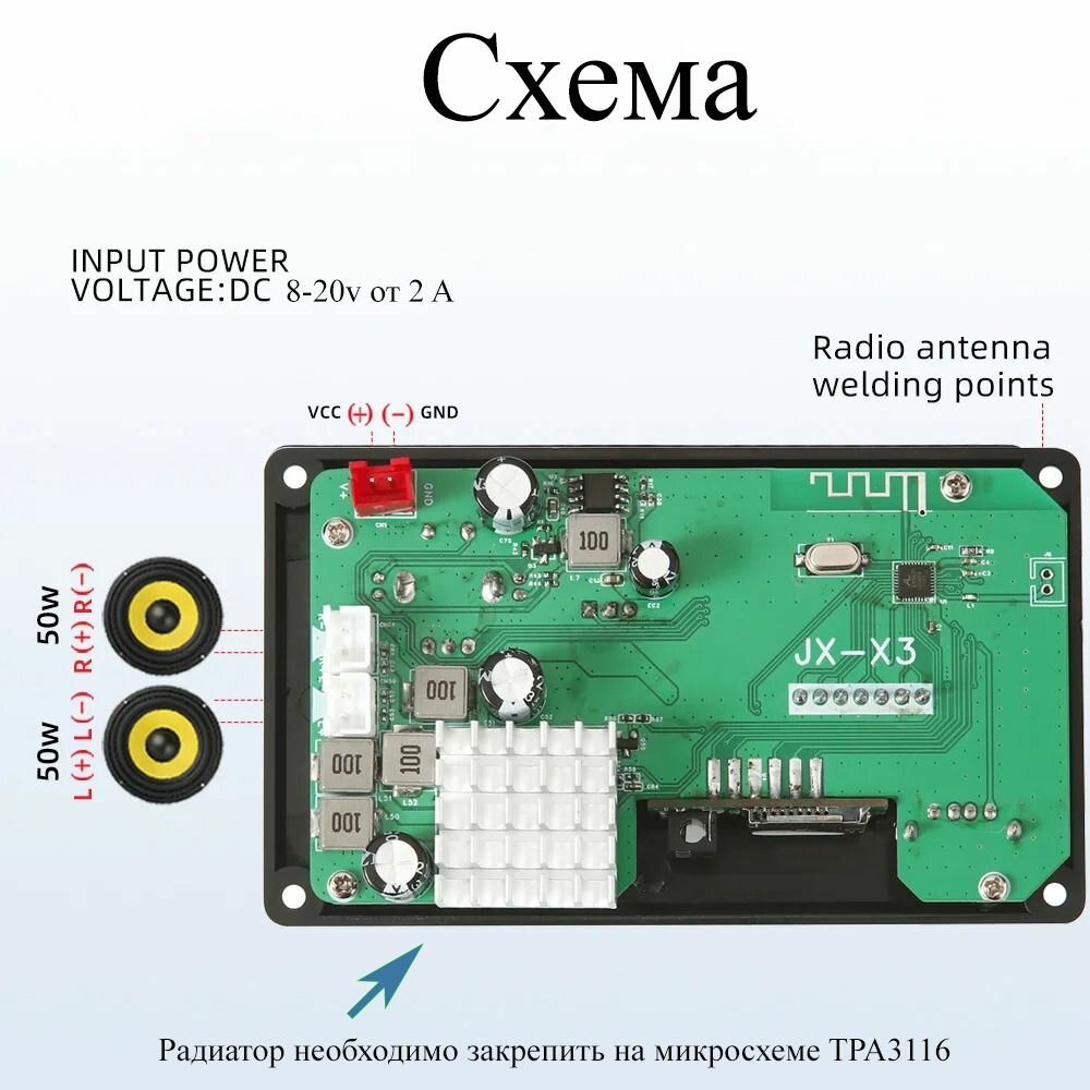 Отзывы на Усилитель мощности звука TPA3116 2X50W / Декодер, плата Bluetooth, AUX, USB, TF, FM 6-12V чип TPA3116 В для домашних стерео систем, колонок, и авто / JX-X3