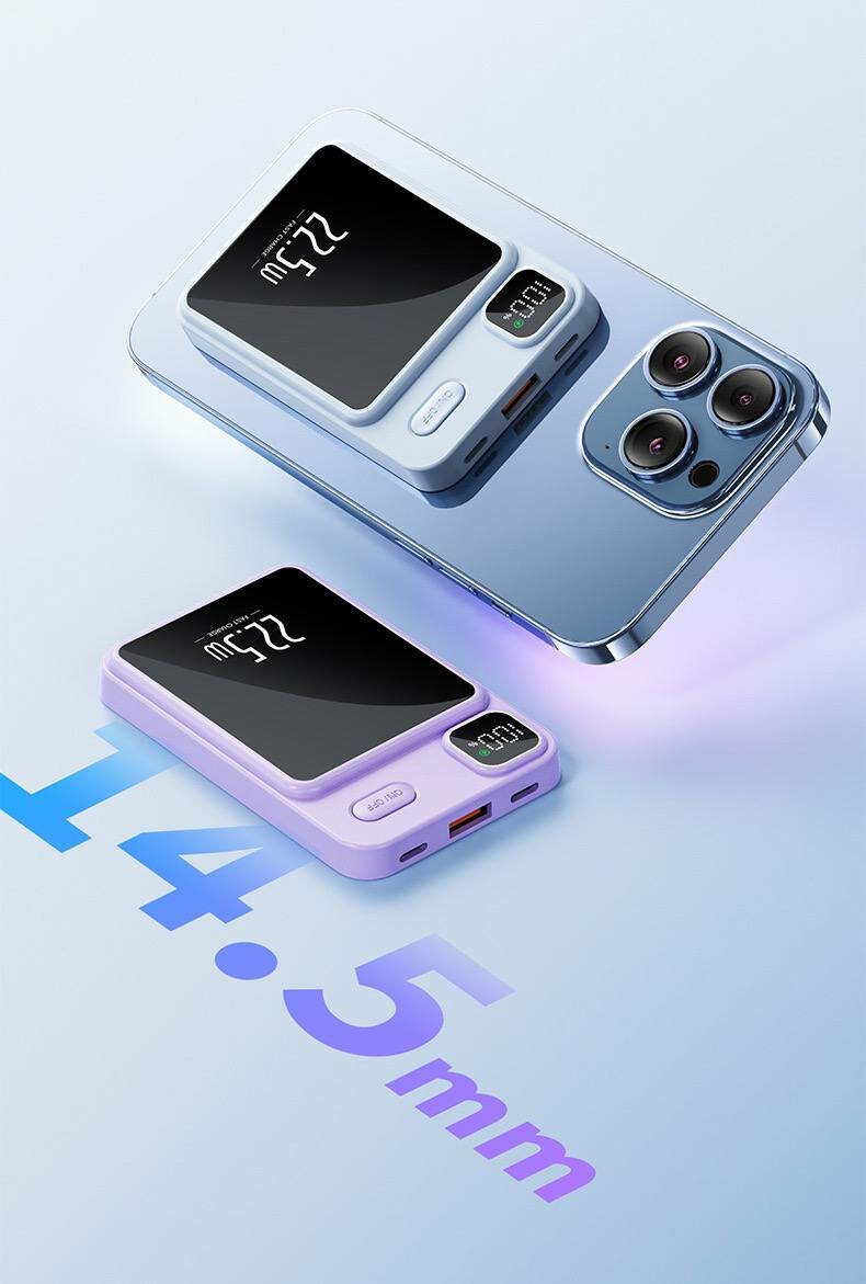 Портативный внешний аккумулятор с поддержкой беспроводной зарядки MAGNETIC, фиолетовый, (10000mAh, Magnetic MagSafe, 22.5W, QC 3.0, PD, 3A, Lightning input, Type-C) 1 399 ₽