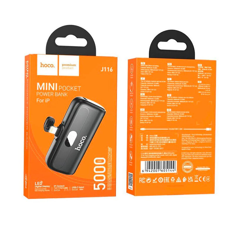 Универсальный Доп. Аккумулятор 5000mAh, J116, HOCO, Lightning, черный информация: