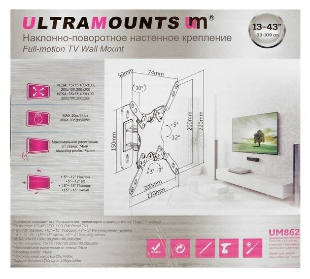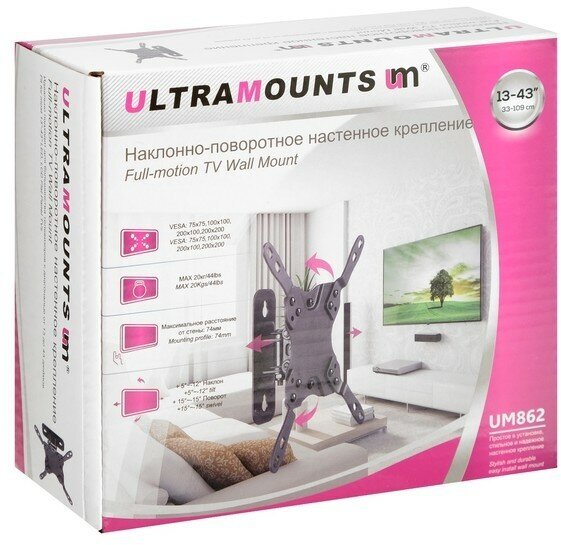 Кронштейн Ultramounts UM862, для ТВ, наклонно-поворотный, 13-43", 74 мм от стены, черный