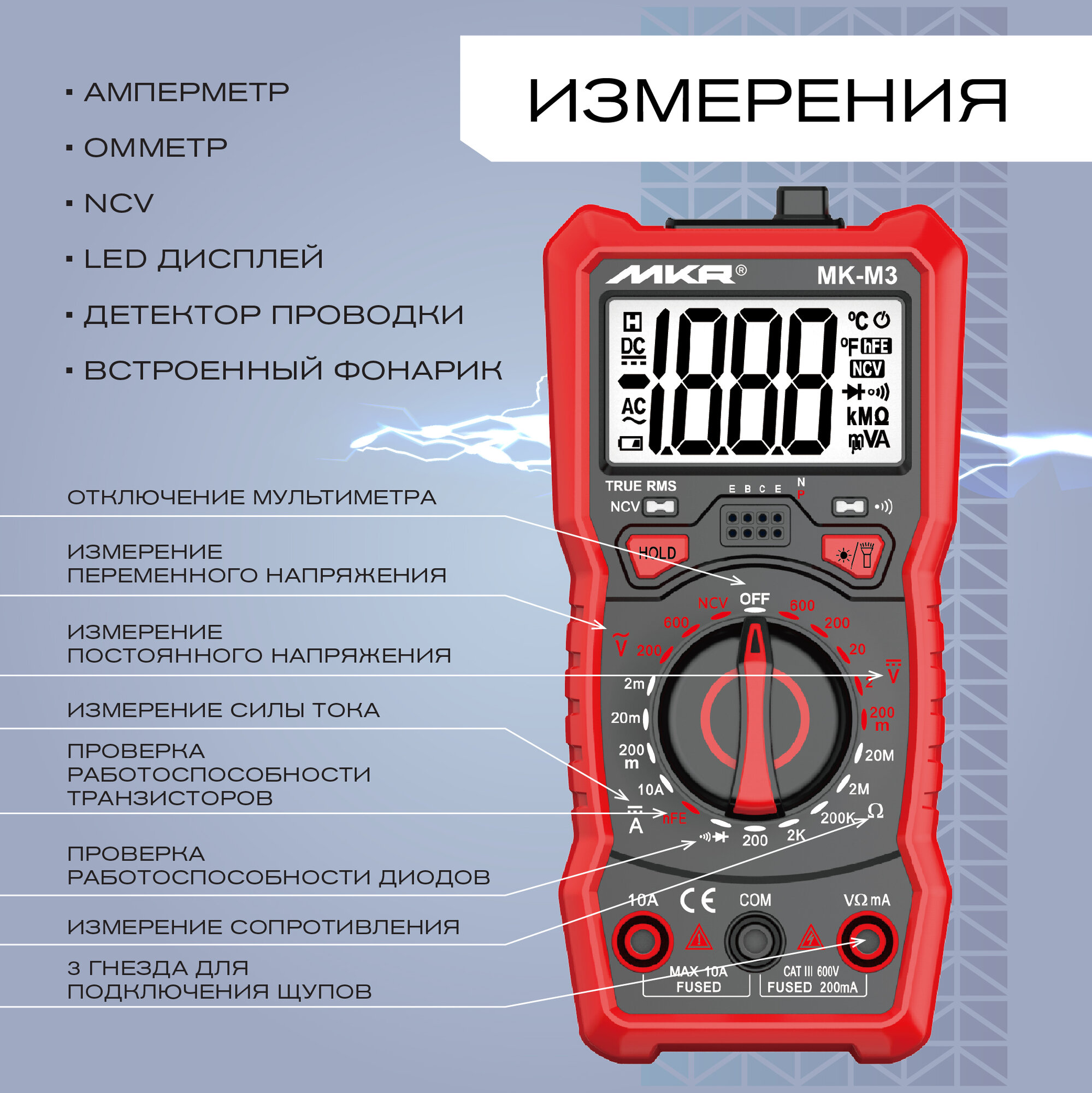 | Функции | выявление повреждения проводки и соединения, измерение емкости конденсаторов, измерение переменного напряжения, измерение постоянного напряжения, измерение работоспособности диодов и транзисторов, измерение силы переменного тока, измерение силы постоянного тока, измерение сопротивления, измерение температуры, измерение частоты |