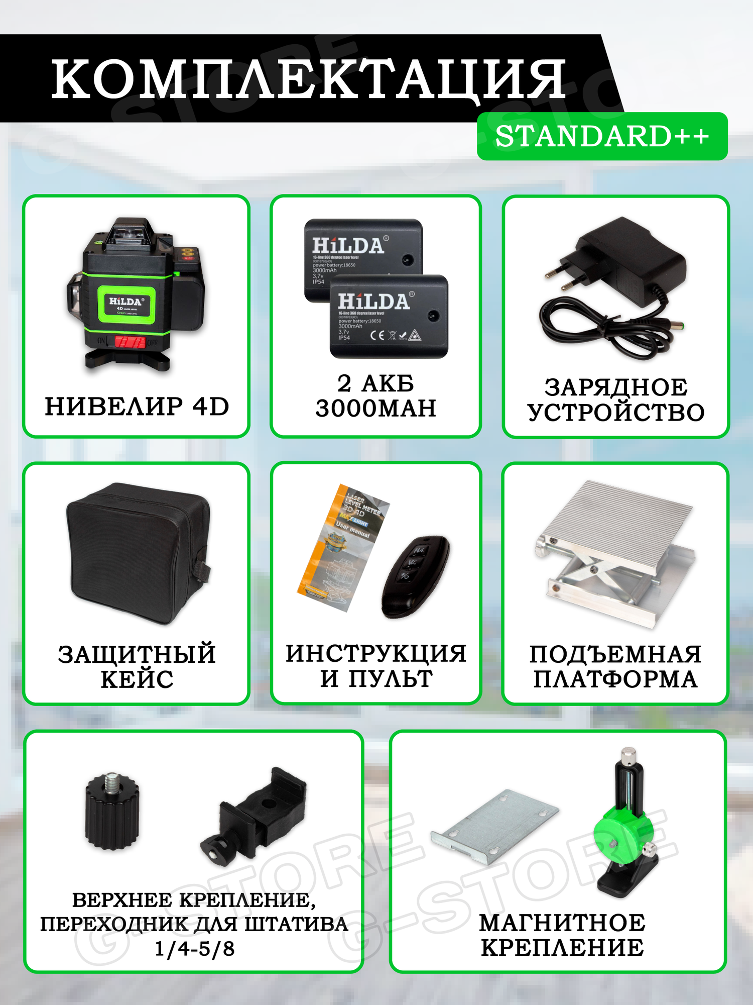 Лазерный уровень HiLDA 4D/16 линий с Дисплеем зеленый луч 2 аккумулятора st++ информация: