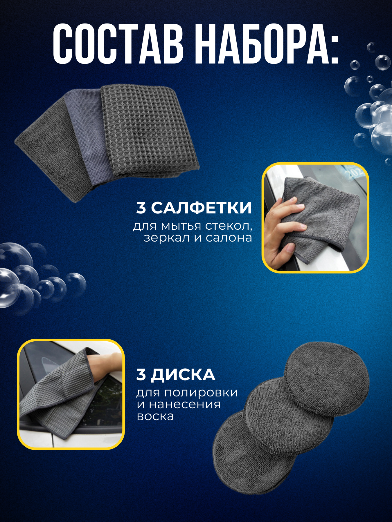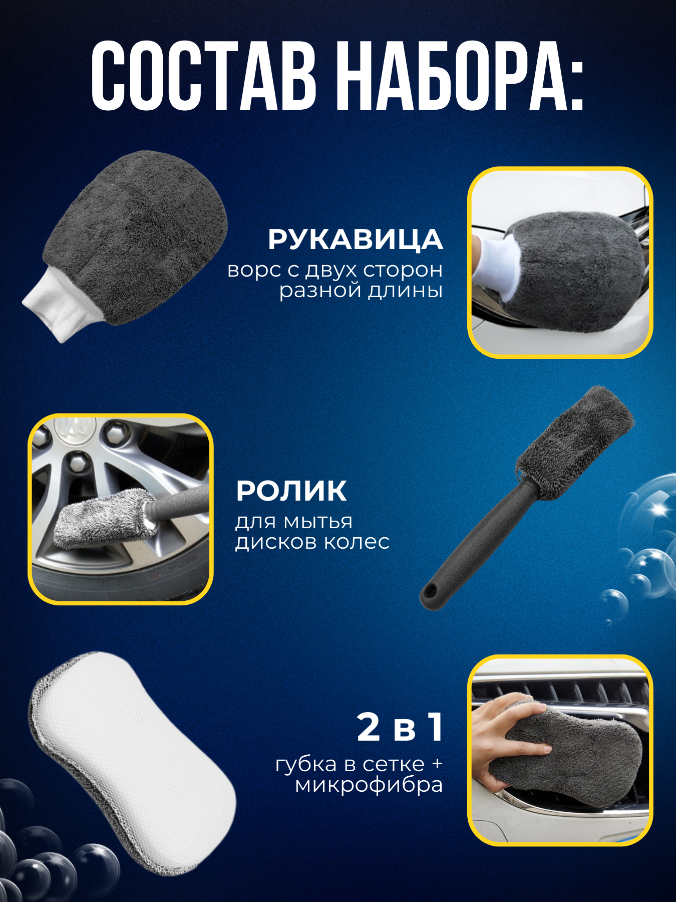 | Подробная комплектация | Рукавица двухсторонняя, ролик для мытья дисков и колес, губка 2в1, 3 салфетки разного назначения, 3 диска для воска и полироли. |