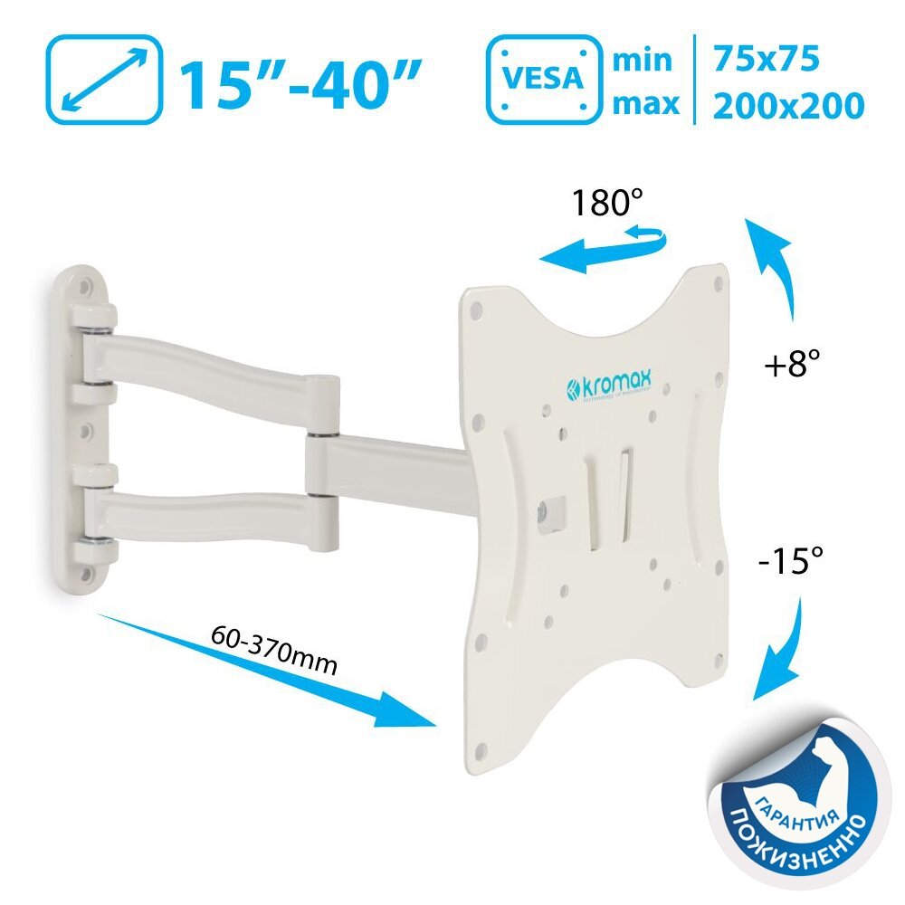 Kromax Крепеж TECHNO-3 white, Кр. алюм. наст. для TV 15"-40", max 20 кг, 4 ст св., нак. 15 , пов. 180 , от ст. 60-370 мм, max VESA 200x200 мм.