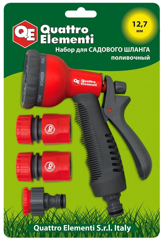 | Комплектация | пистолет поливочный QUATTRO ELEMENTI 8-ми режимный, мягкий пластик + набор соединителей 3 - 1шт |