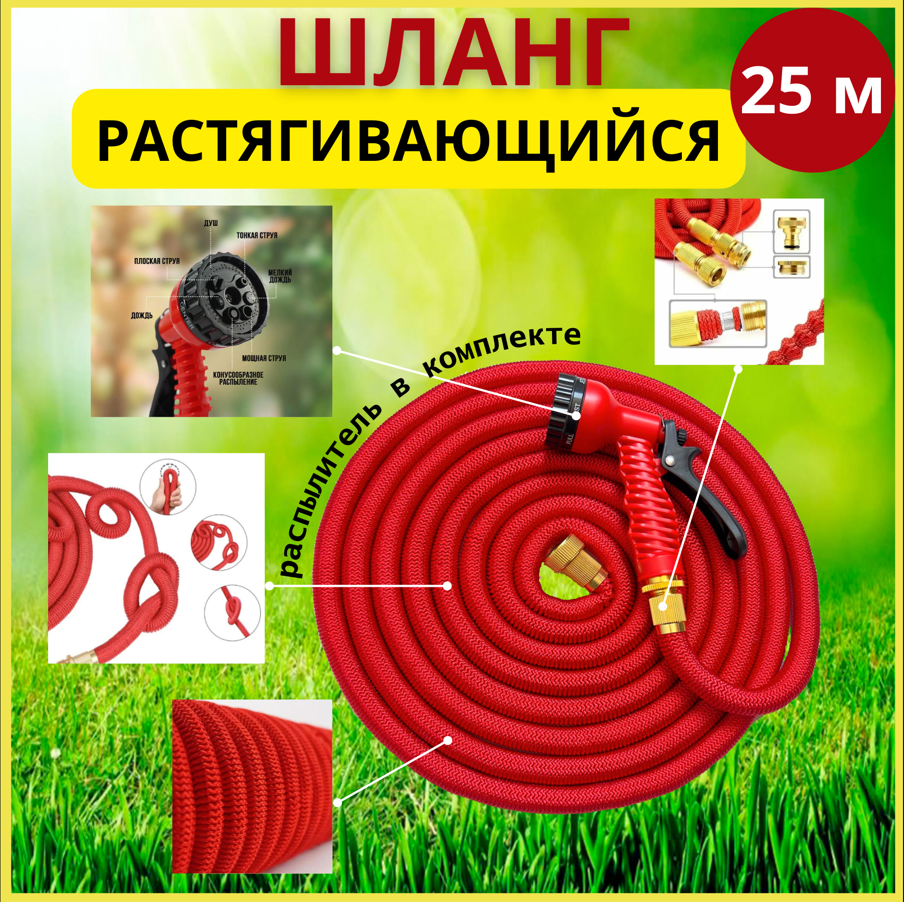 Шланг садовый красный растягивающийся 25 метров для полива с распылителем, с металлическим соединениям информация: