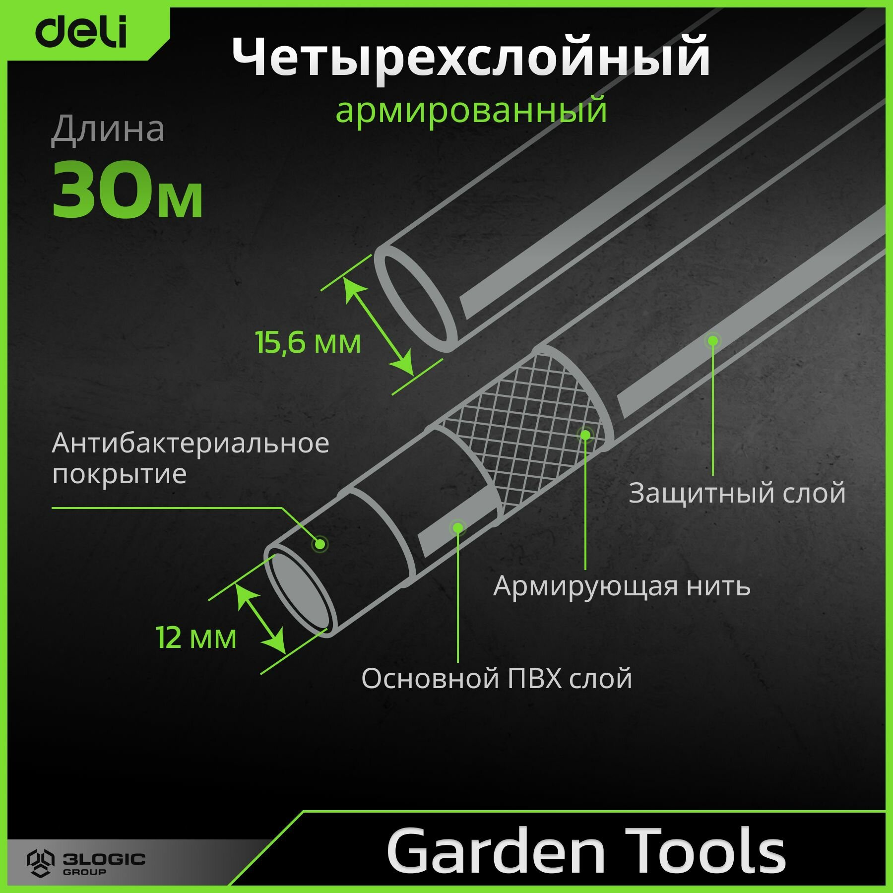 Шланг поливочный армированный четырёхслойный 30 метров Deli DL8072-30 (1/2 дюйма, давление до 25 бар, серый) информация: