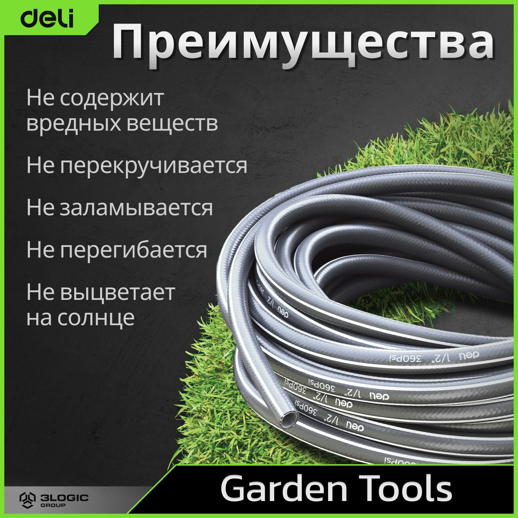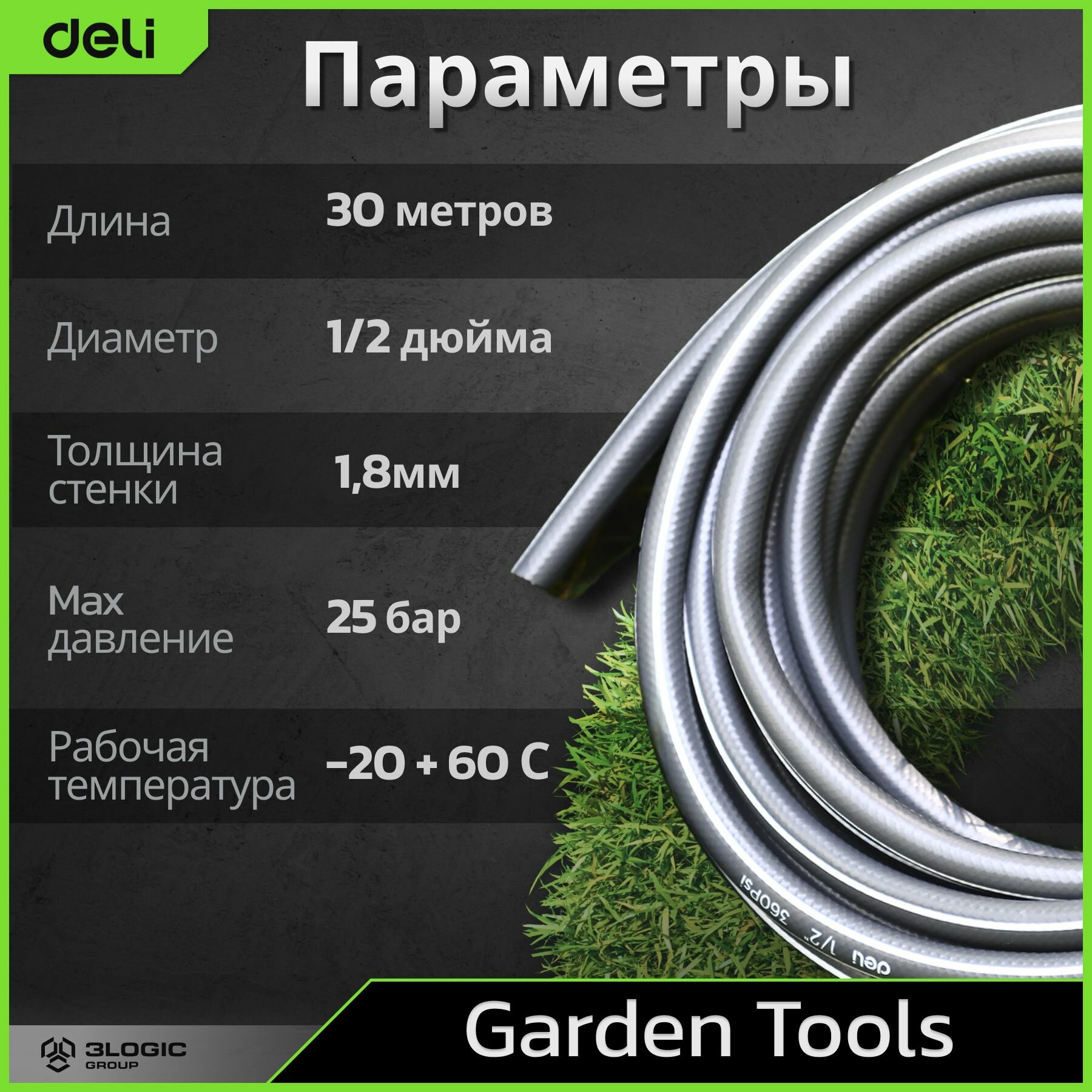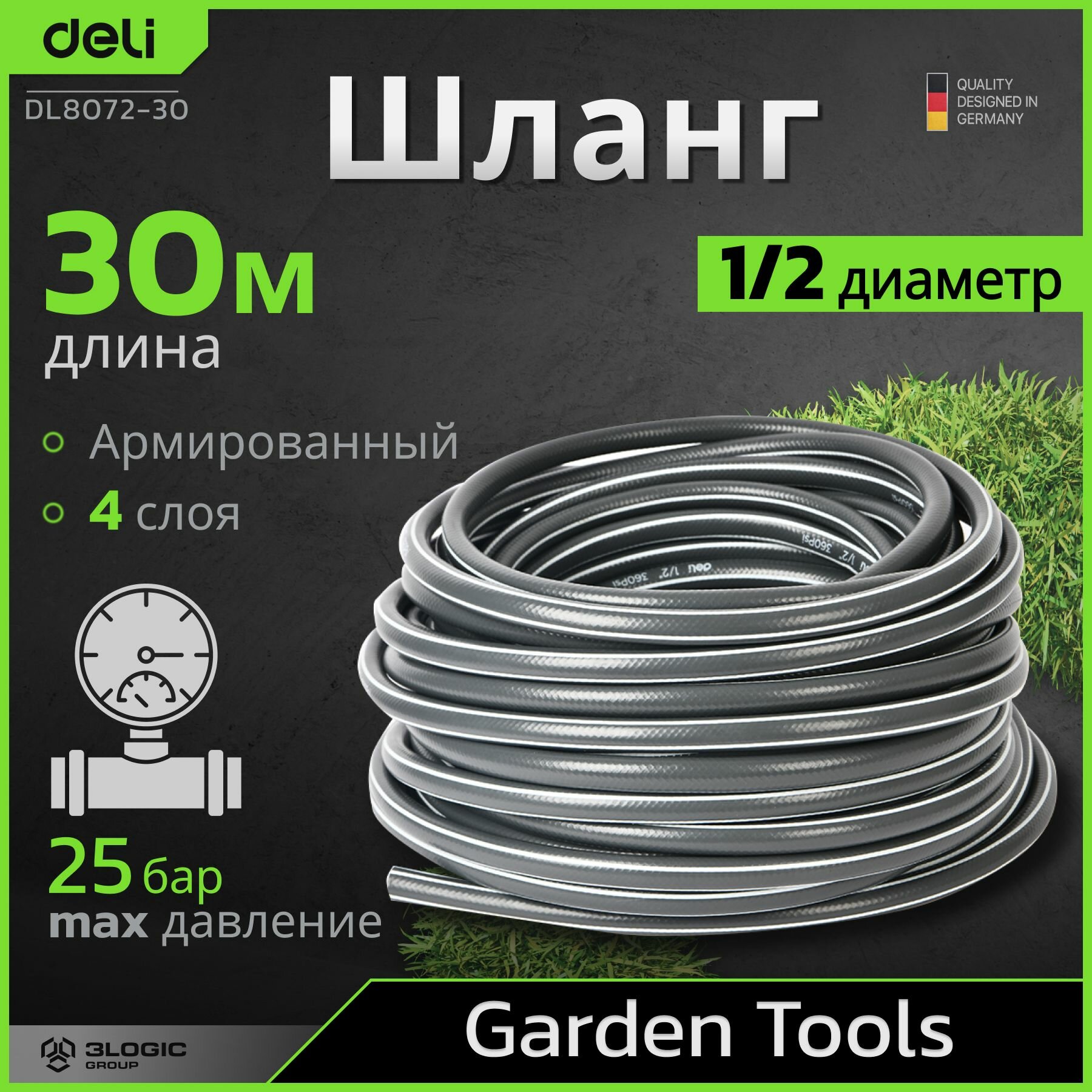 10 цен на Шланг поливочный армированный четырёхслойный 30 метров Deli DL8072-30 (1/2 дюйма, давление до 25 бар, серый)