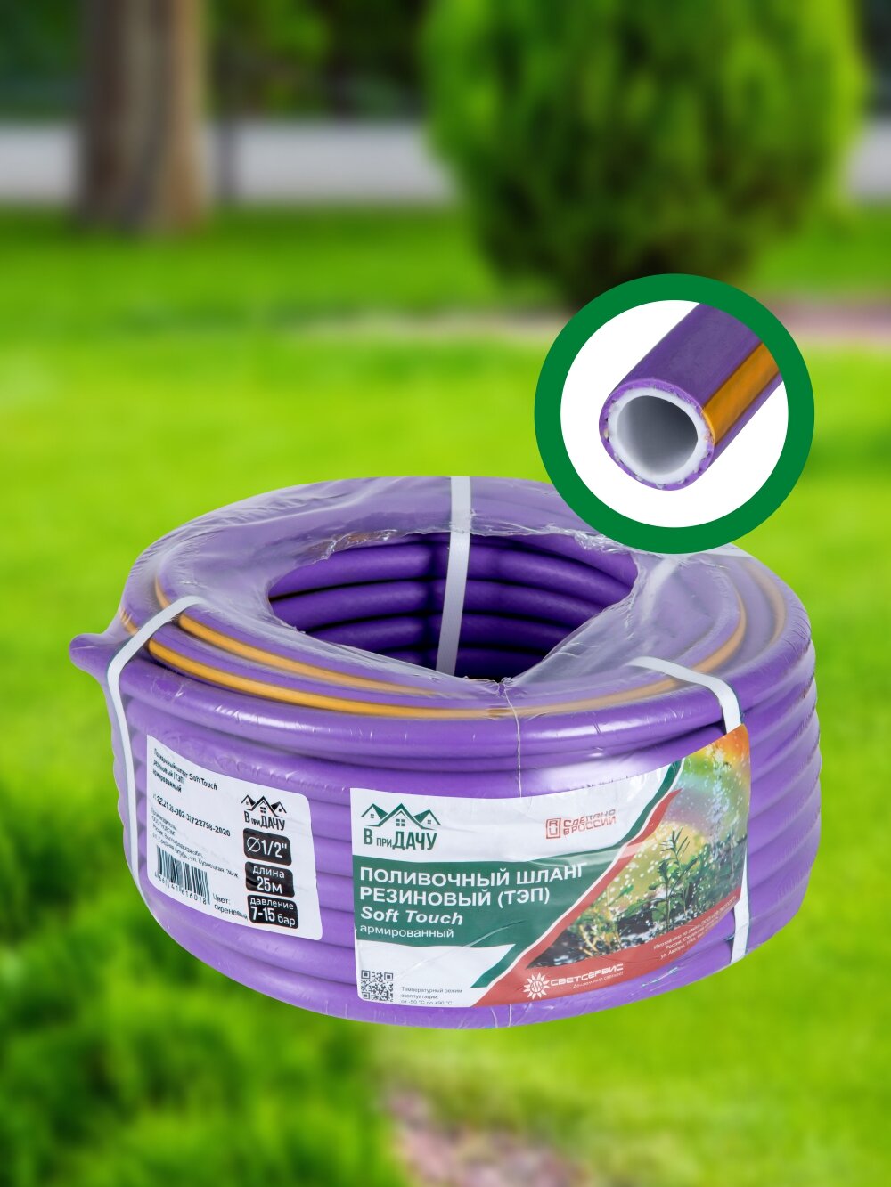 Шланг поливочный Резиновый (ТЭП) Soft Touch армированный, 1/2", 25 м, сиреневый, давление 7-15 бар. В придачу информация:
