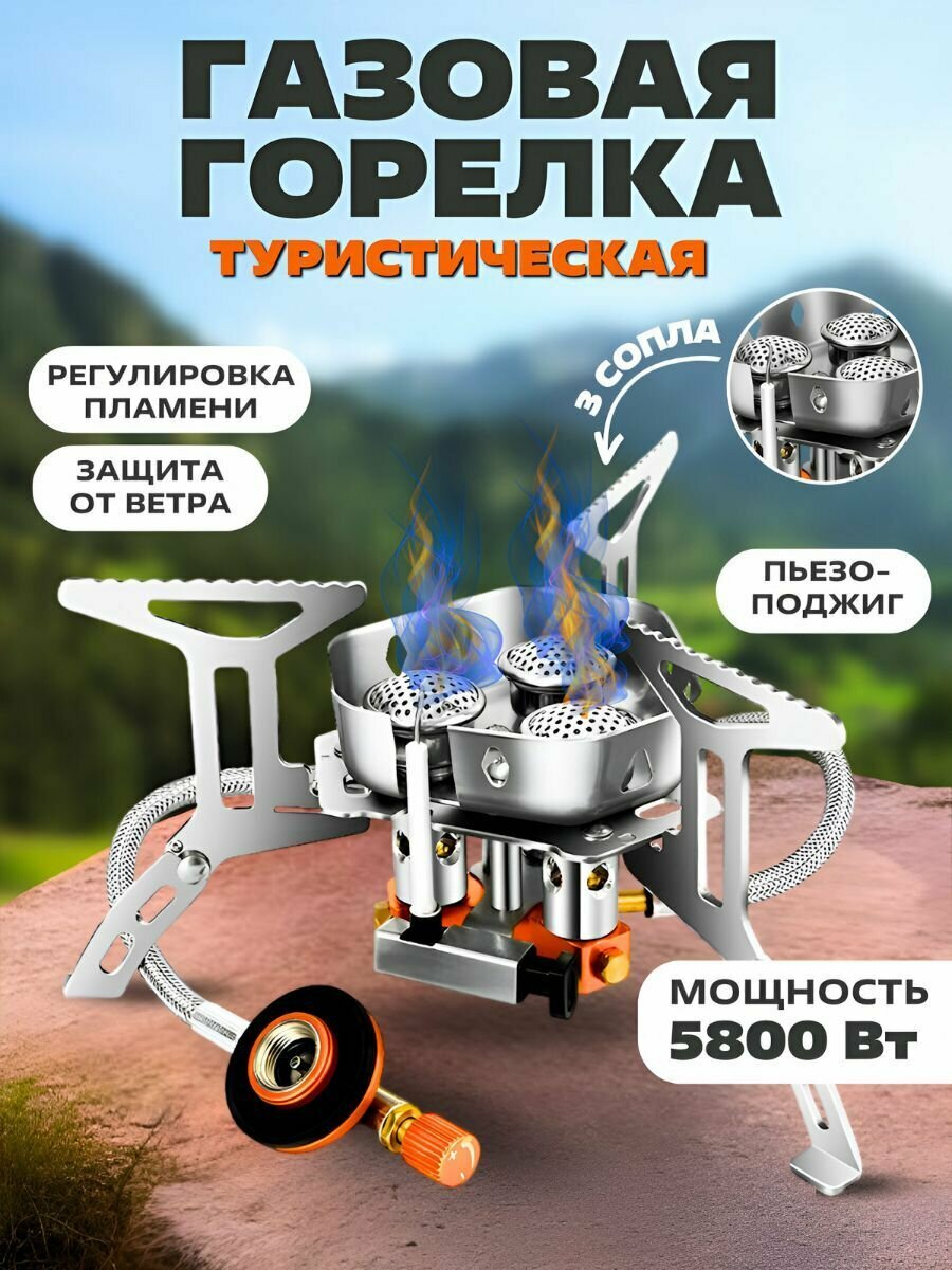 10 цен на Горелка туристическая газовая мощная с переходником,3 сопла