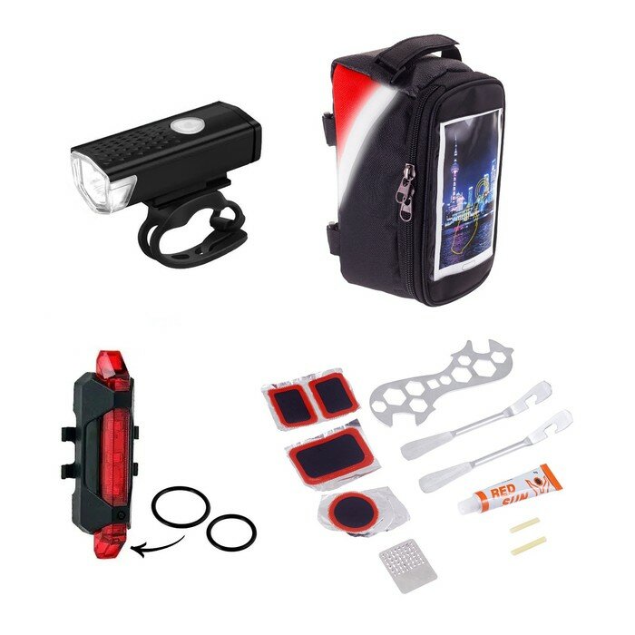 Набор для велосипеда 3 в 1: фонарь аккумуляторный, ремонтный набор, сумка (1шт.) информация: