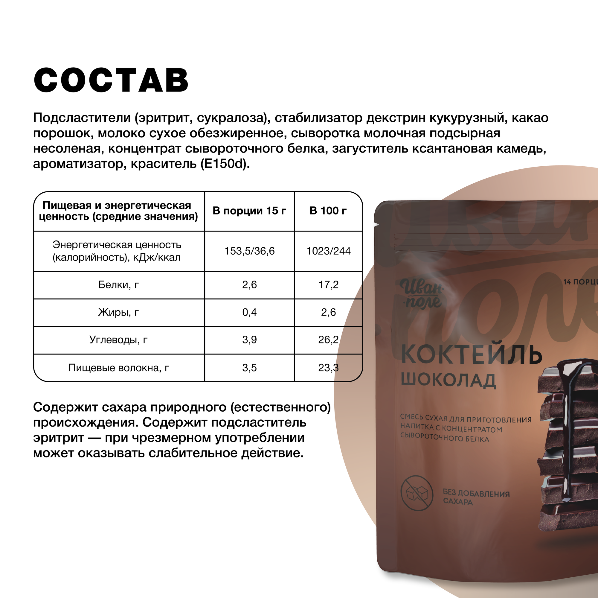 Коктейль молочный Иван-поле Шоколад, протеиновый белковый коктейль без сахара для похудения, 210 г информация: