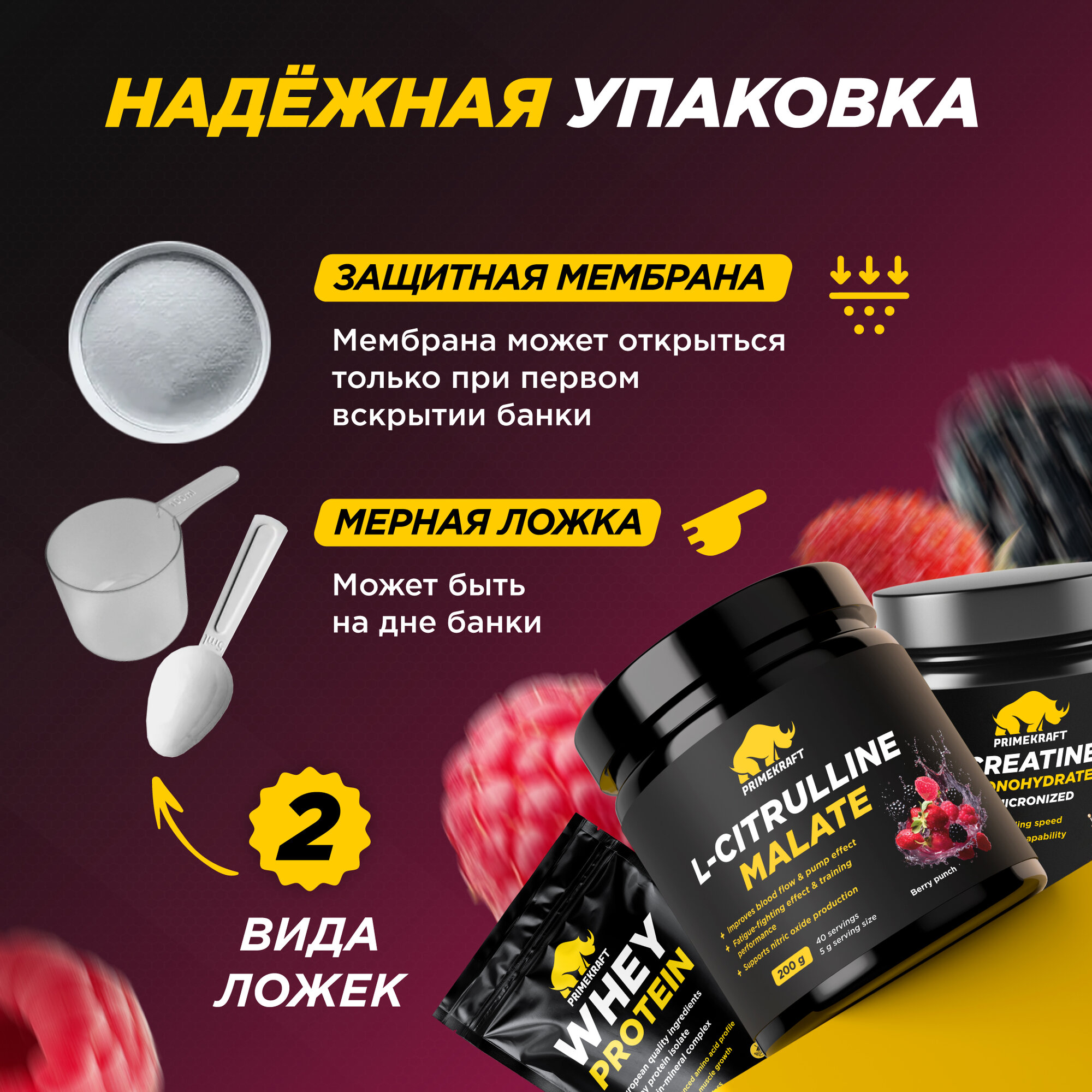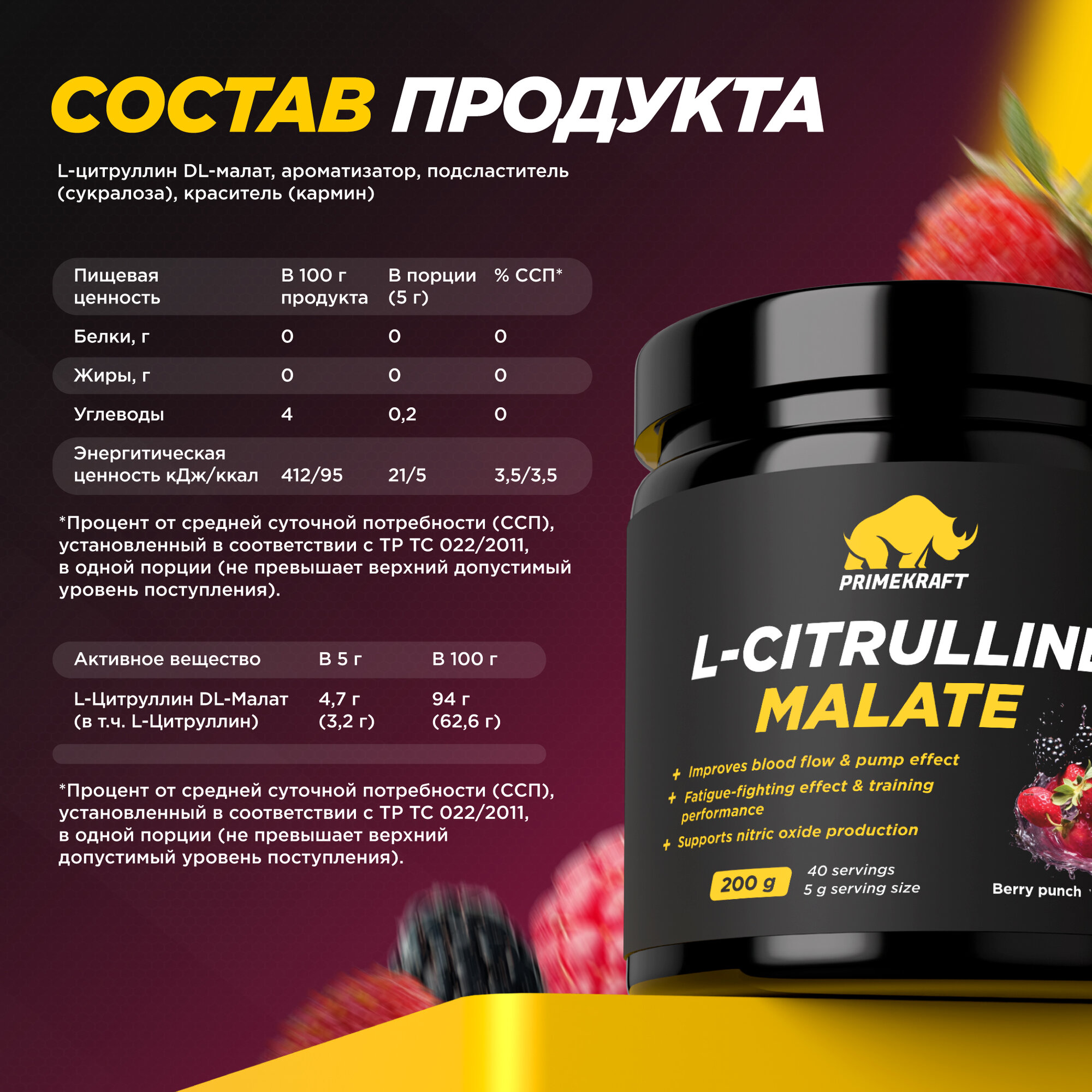 Аминокислоты PRIMEKRAFT L-Citrulline Malate Цитруллин малат со вкусом berry punch / 200 гр (ягодный пунш) / 40 порций информация: