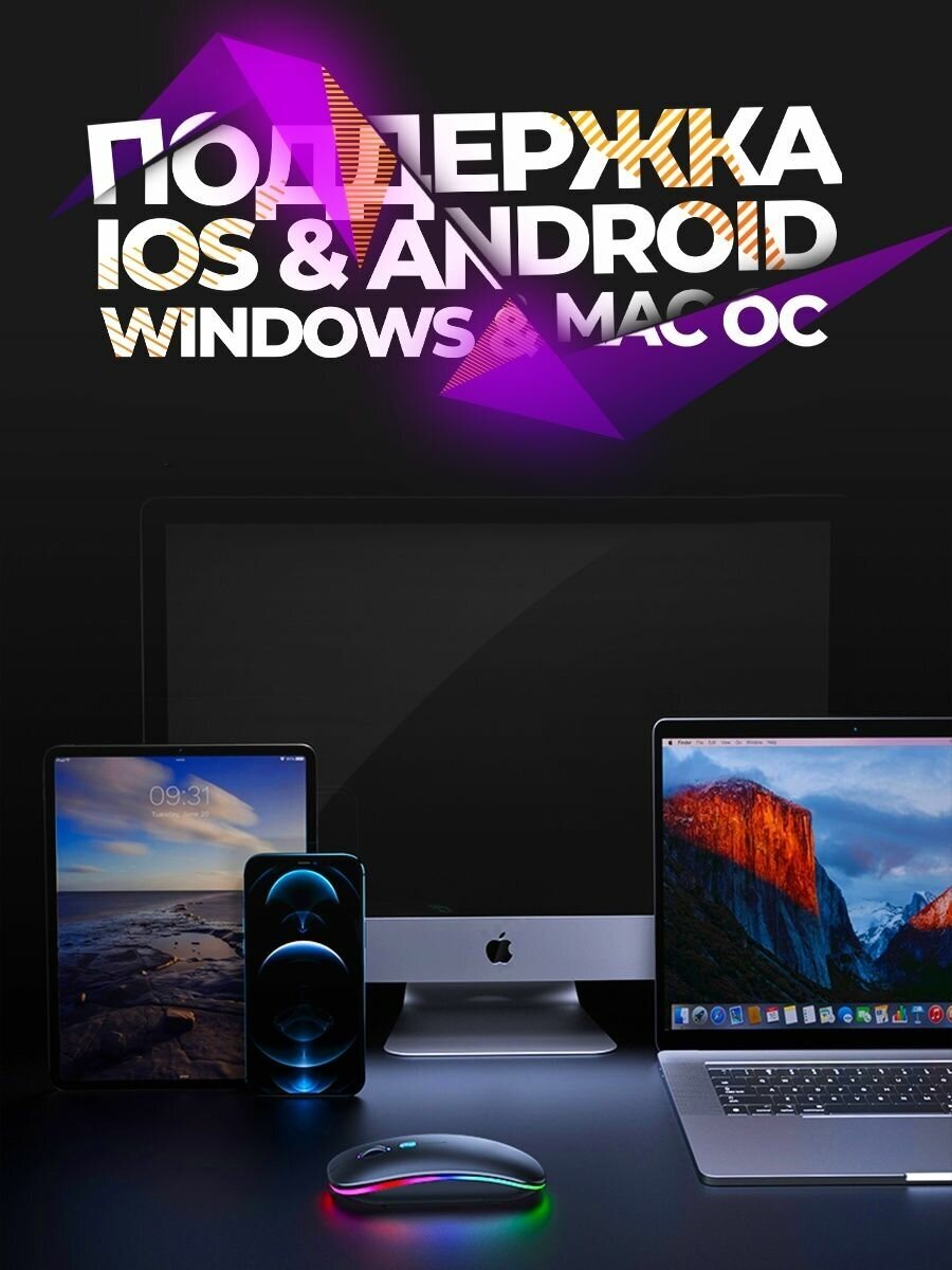 Мышь беспроводная компьютерная аккумуляторная / 3 режима DPI (800/1200/1600) Bluetooth + USB 2.4Ghz / RGB подсветка /