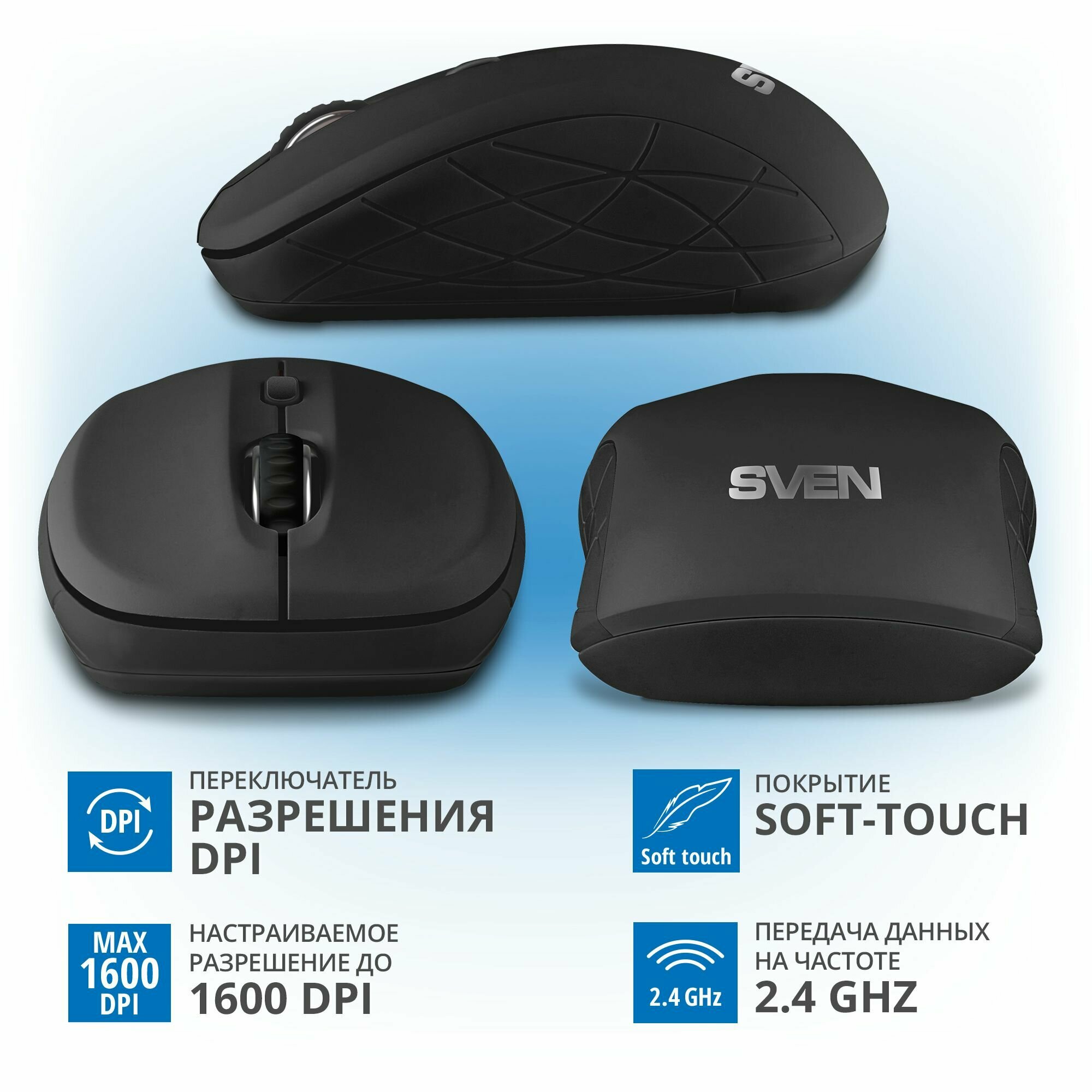 Мышь беспроводная компьютерная оптическая SVEN RX-230W / 800-1600 DPI / Soft Touch 448 ₽