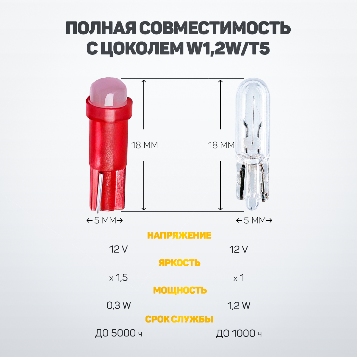 Светодиодная лампа для подсветки панели приборов T5, 12 V, 10 штук, красный цвет 300 ₽