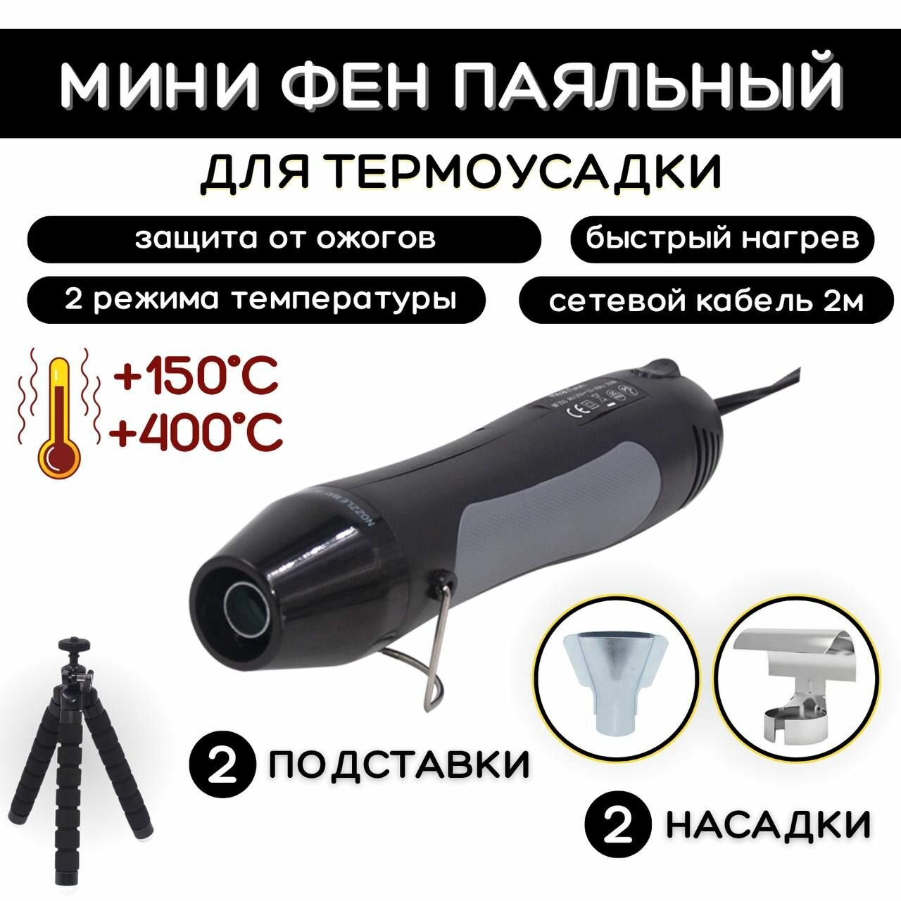 10 цен на Мини паяльный фен для термоусадки KEBBI FOUR 230V, 400С, 350W, черный, регулировка 2 насадки,подставка,штатив