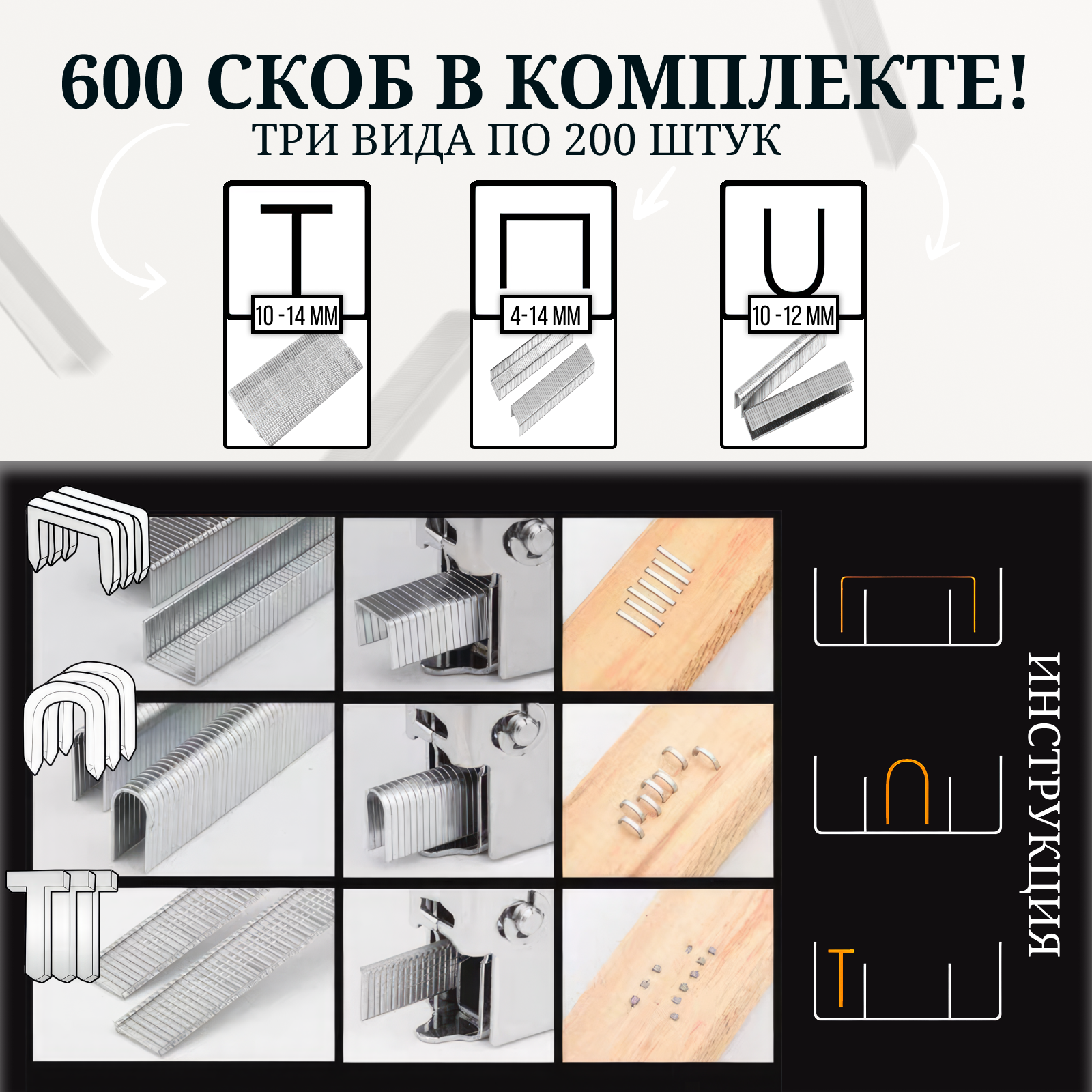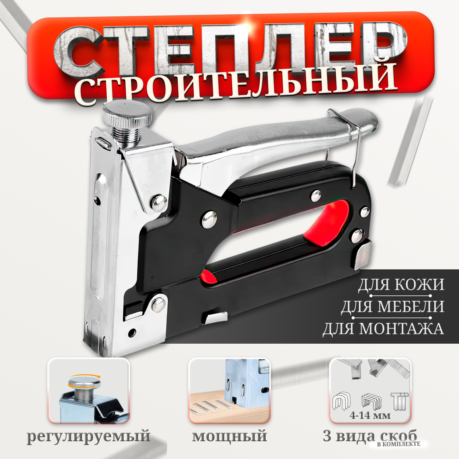 Универсальный строительный, мебельный степлер - пистолет регулируемый с 3 видами скоб 4-14 мм 600 шт, металлический корпус информация: