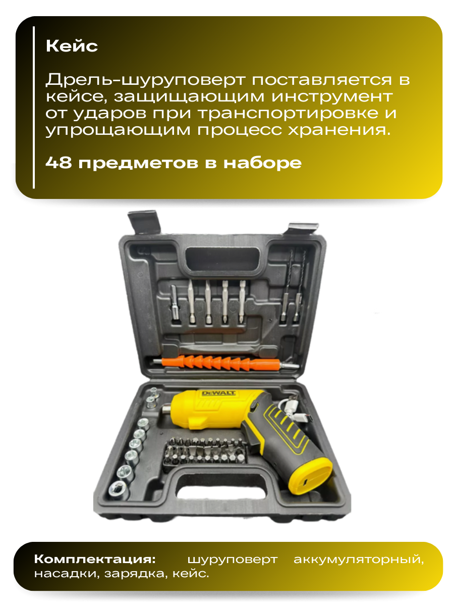 | Комплектация | насадки 46 шт.; отвертка аккумуляторная; гибкий вал; usb провод; кейс |