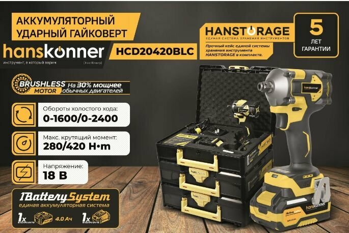 Гайковерт аккумуляторный Hanskonner HCD20420BLC ударный бесщеточный (18В, 1акк*4Ач 1BatterySystem, 1/2", 420Нм, кейсHS) информация: