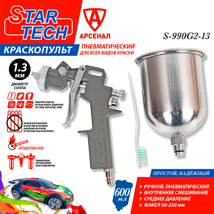 Отзывы на Краскопульт пневматический StarTech (сопло 1,3 мм) верхний мет. бачок 600 мл, мод., S-990G2-13