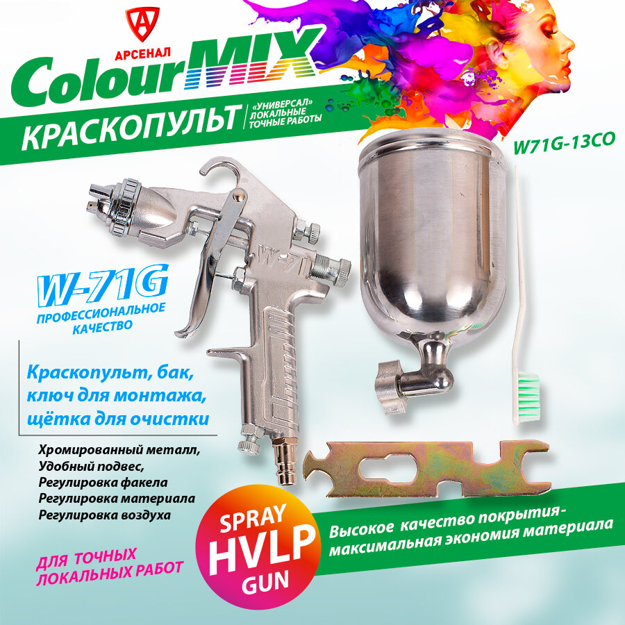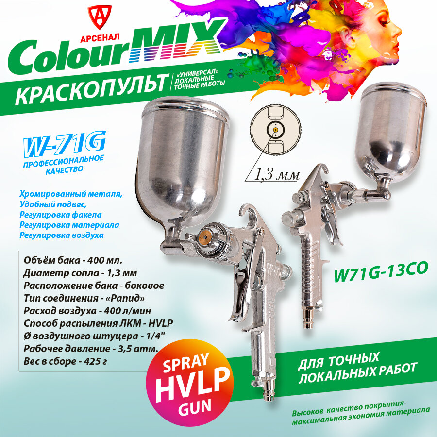 Краскопульт пневматический с верхним (боковым) алюминиевым бачком 400мл., сопло 1,3 COLOUR MIX, W71G-13СO информация: