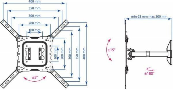 Кронштейн Kromax DIX-17 black, настенный для TV 22"-55", max 40 кг, 4 ст св., нак. ±15°, пов. 180°, от ст. 63-300 мм, max VESA 400x400 мм. 1 935 ₽