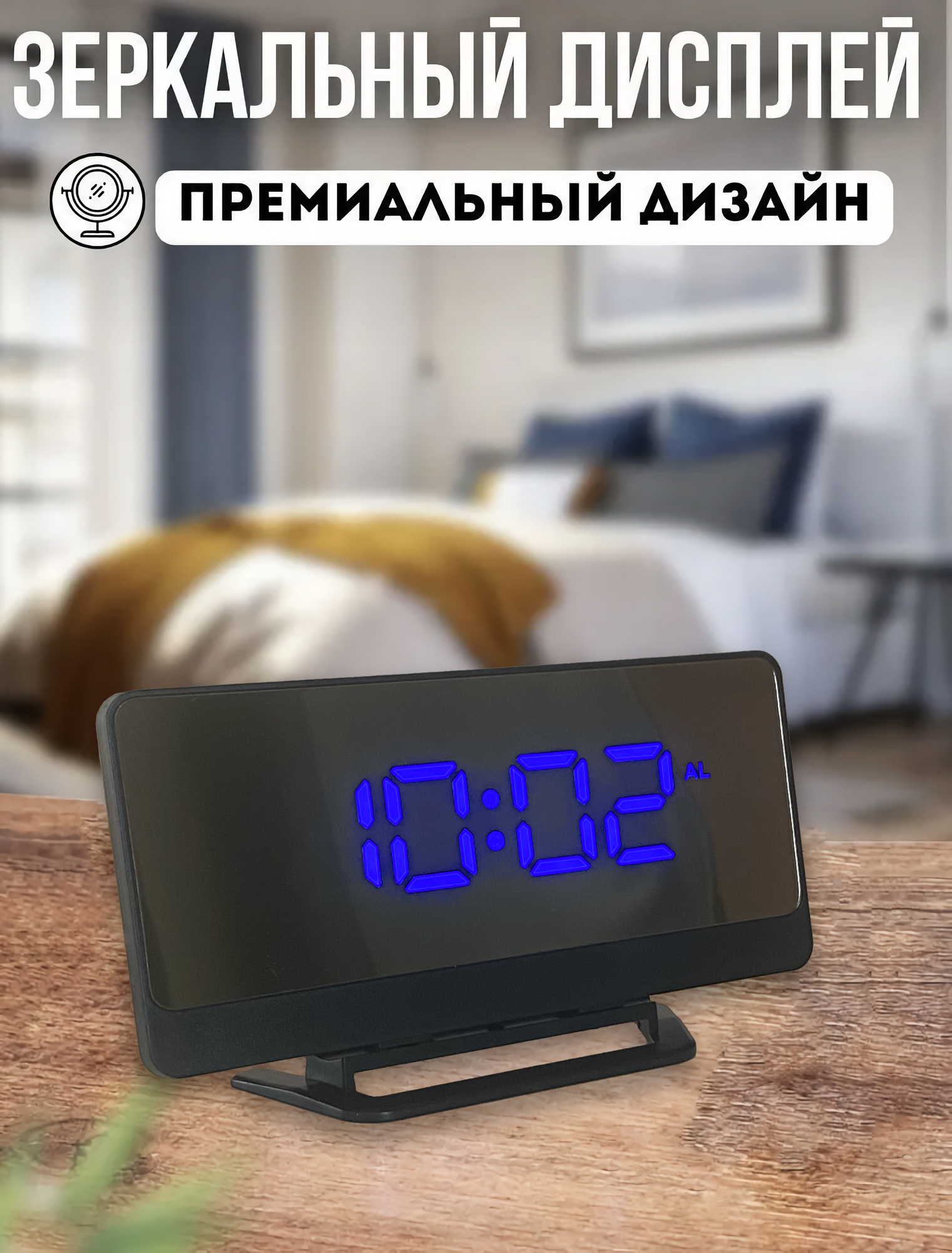 10 цен на Часы настольные зеркальные электронные с будильником, датчиком температуры, светодиодная синяя подсветка