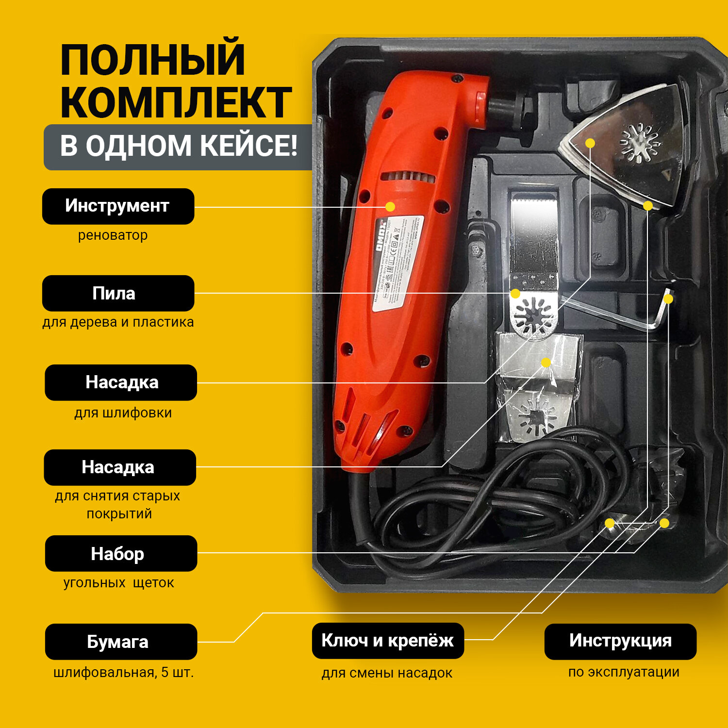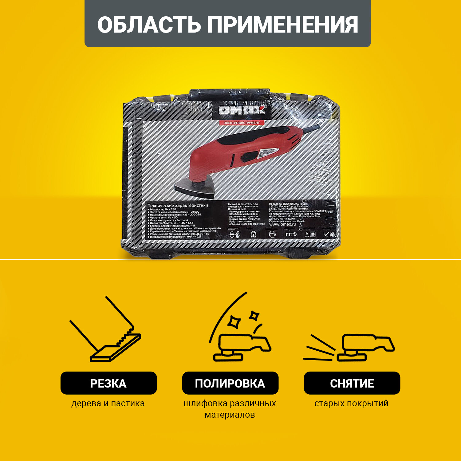 | Комплектация | Многофункциональный инструмент - 1 Пила для дерева и пластика - 1 Треугольная насадка для шлифовки - 1 Насадка для снятия старых покрытий - 1 Шлифовальная бумага - 5 Набор угольных щеток - 1 Инструкция - 1 Кейс - 1 |