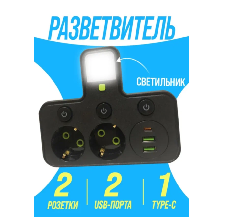 Тройник разветвитель сетевой 2 розетки 2 USB + Type-C с подсветкой