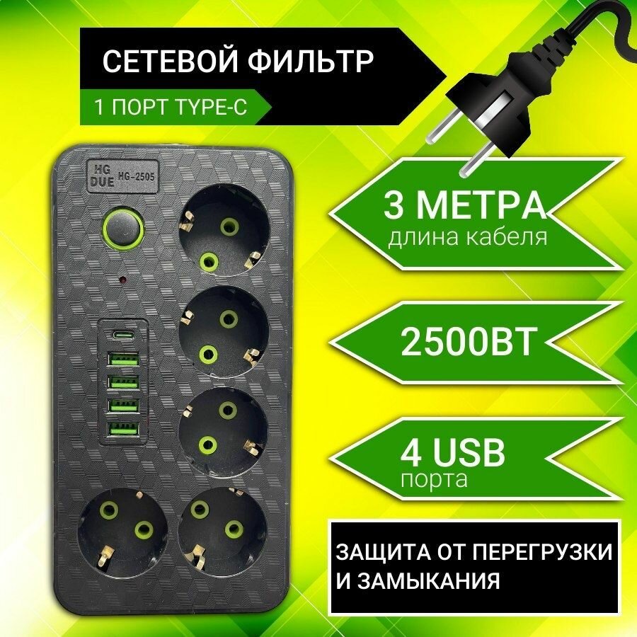 Сетевой фильтр с 5 розетками 4 USB + 1 Type-C Многофункциональный удлинитель с предохранителем Провод 3 метра Выключатель на корпусе информация: