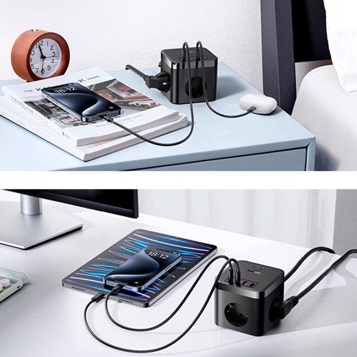 Отзывы на Быстрое настольное зарядное устройство 7 в 1: 3-Розетки+2U+2C 30W Baseus PowerCombo Cube Power Strip, длина кабеля 1.5 м EU (E00066400117-00)