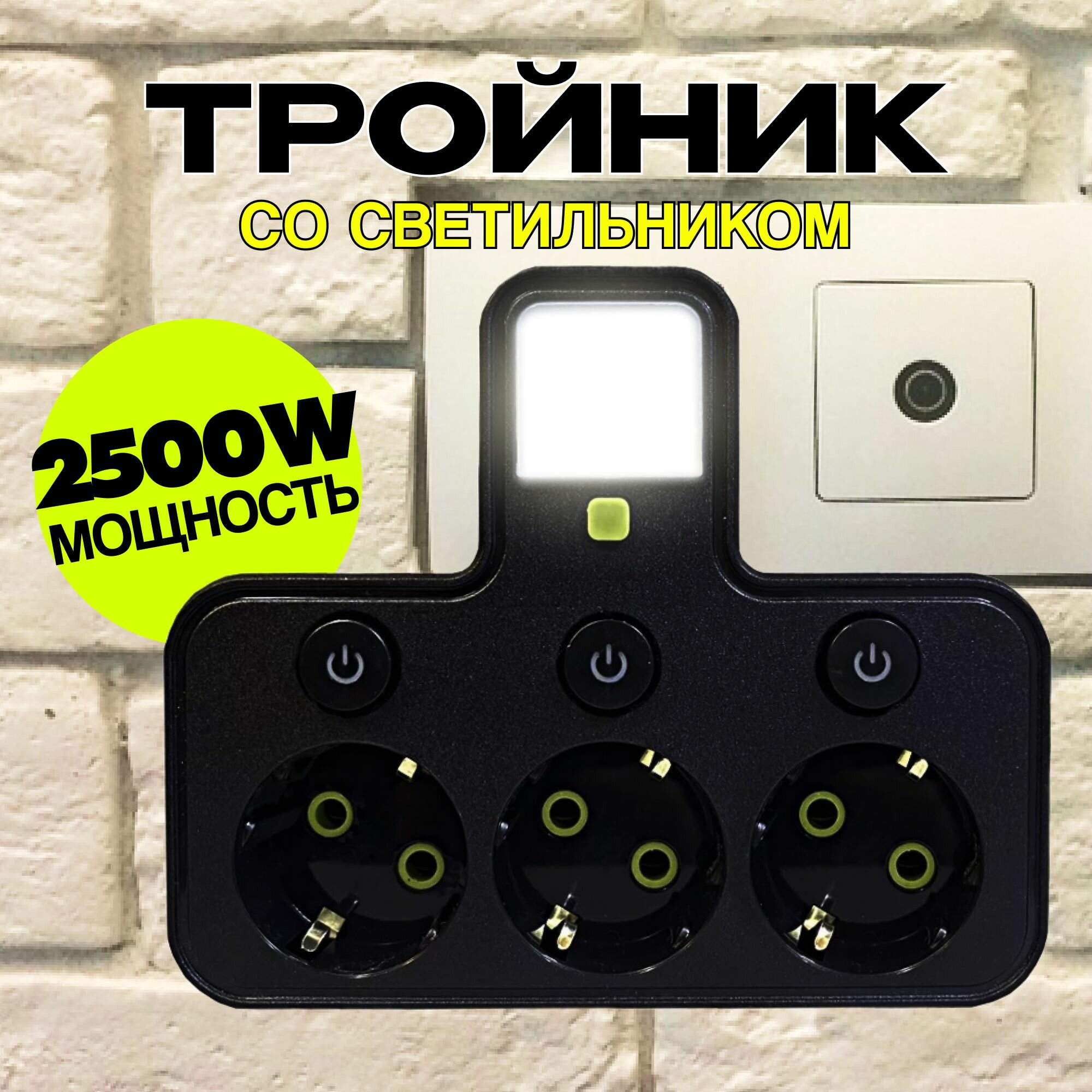 10 цен на Тройник в розетку 3 гнезда с раздельными выключателями. Сетевой фильтр электрический с фонариком