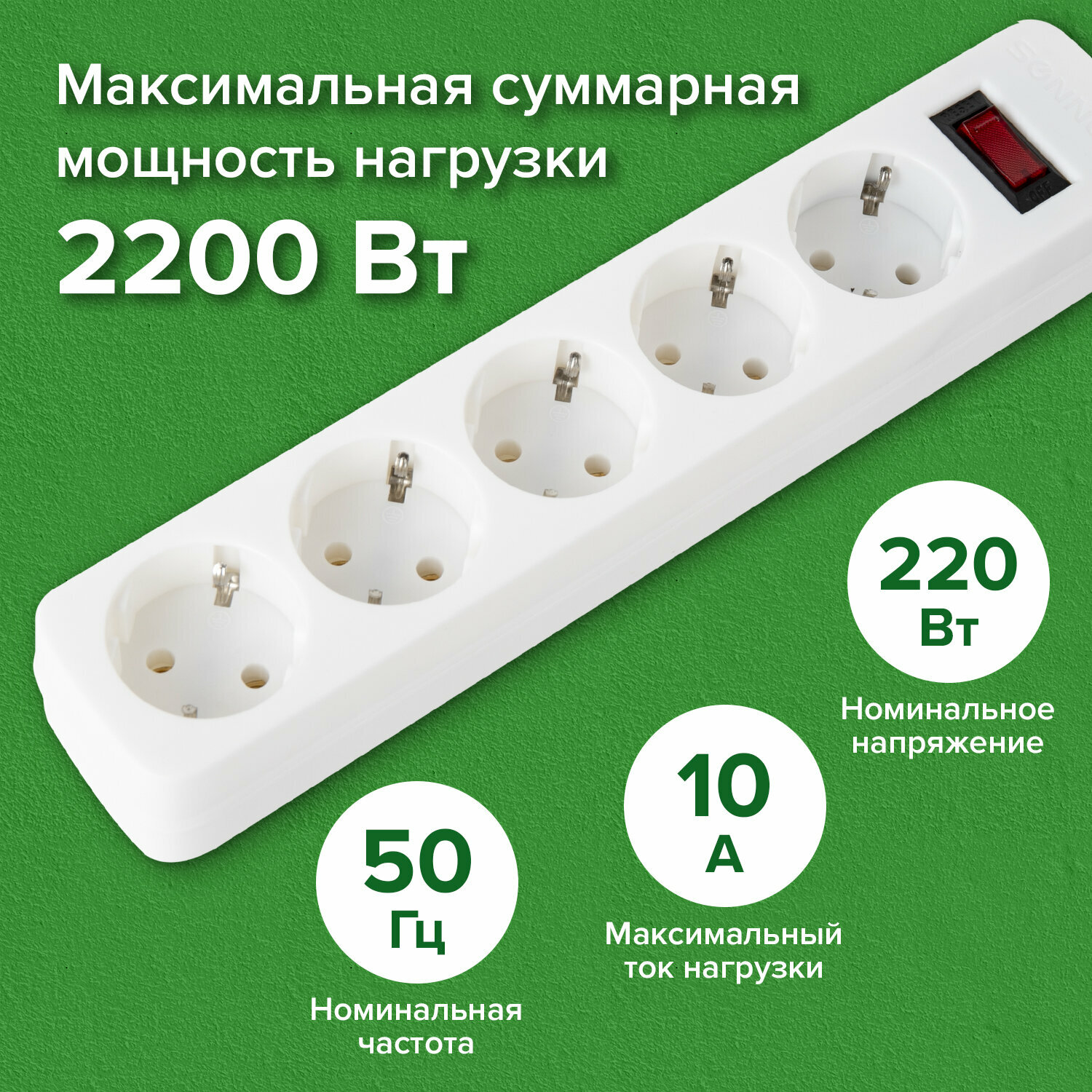 Сетевой фильтр SONNEN SPW-305, 5 розеток с заземлением, выключатель, 10 А, 3 м, белый, 513654
