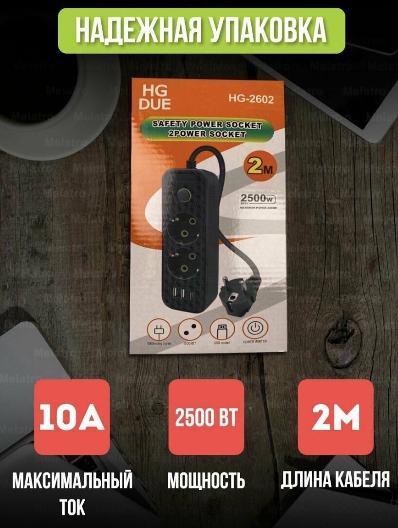 Сетевой фильтр, бытовой удлинитель с Type-C и USB, длина 2 метра информация: