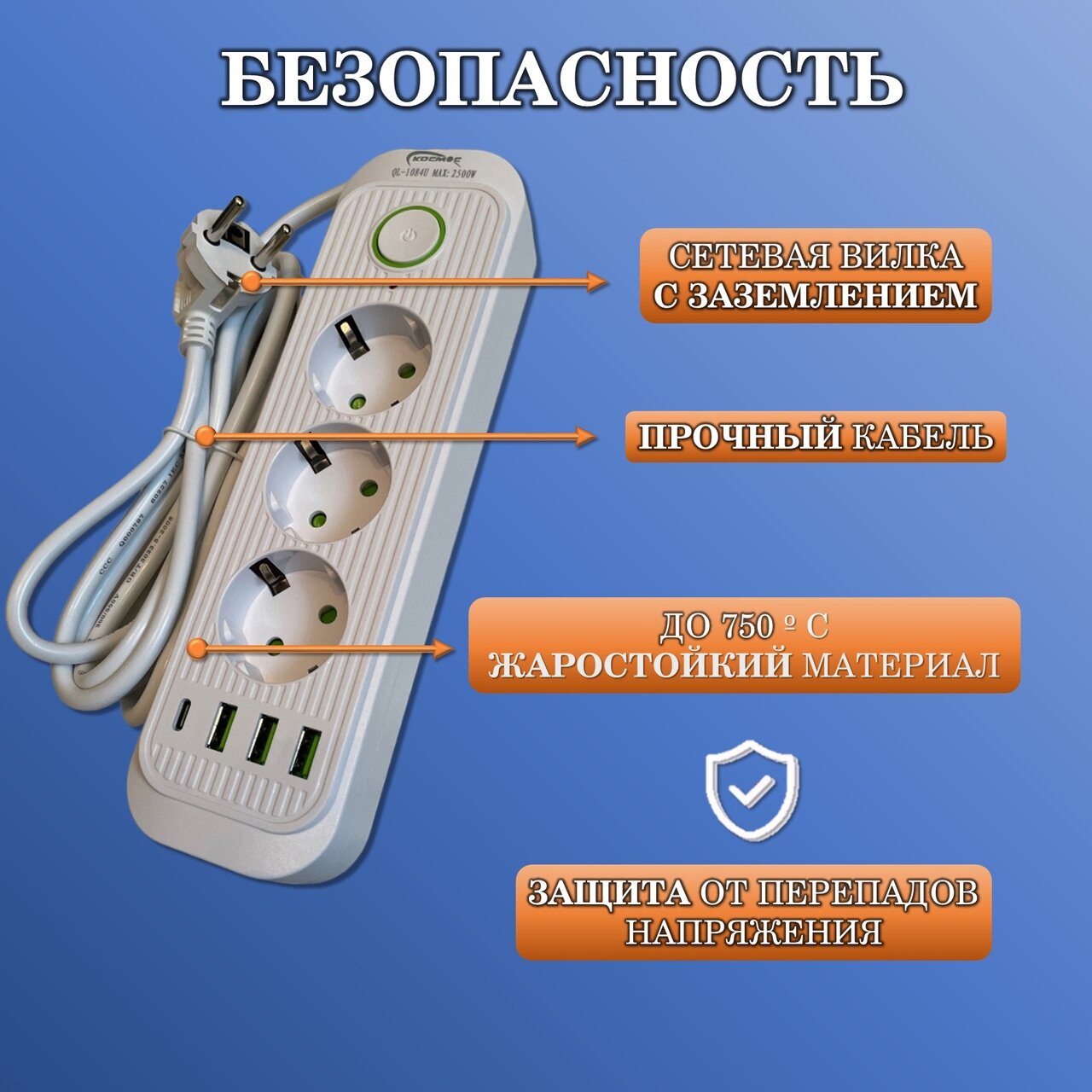 | Дополнительная информация | 3х USB, 1х USB Type-C, розетки со шторками , Жаростойкий материал - до 750 градусов , защита от перепадов напряжения |