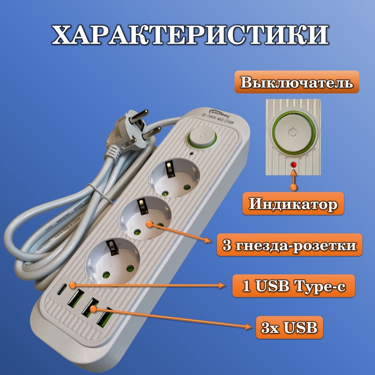 | Особенности | USB порт, выключатель на корпусе, световая индикация, удлинитель для переноса освещения, шторки на розетке |