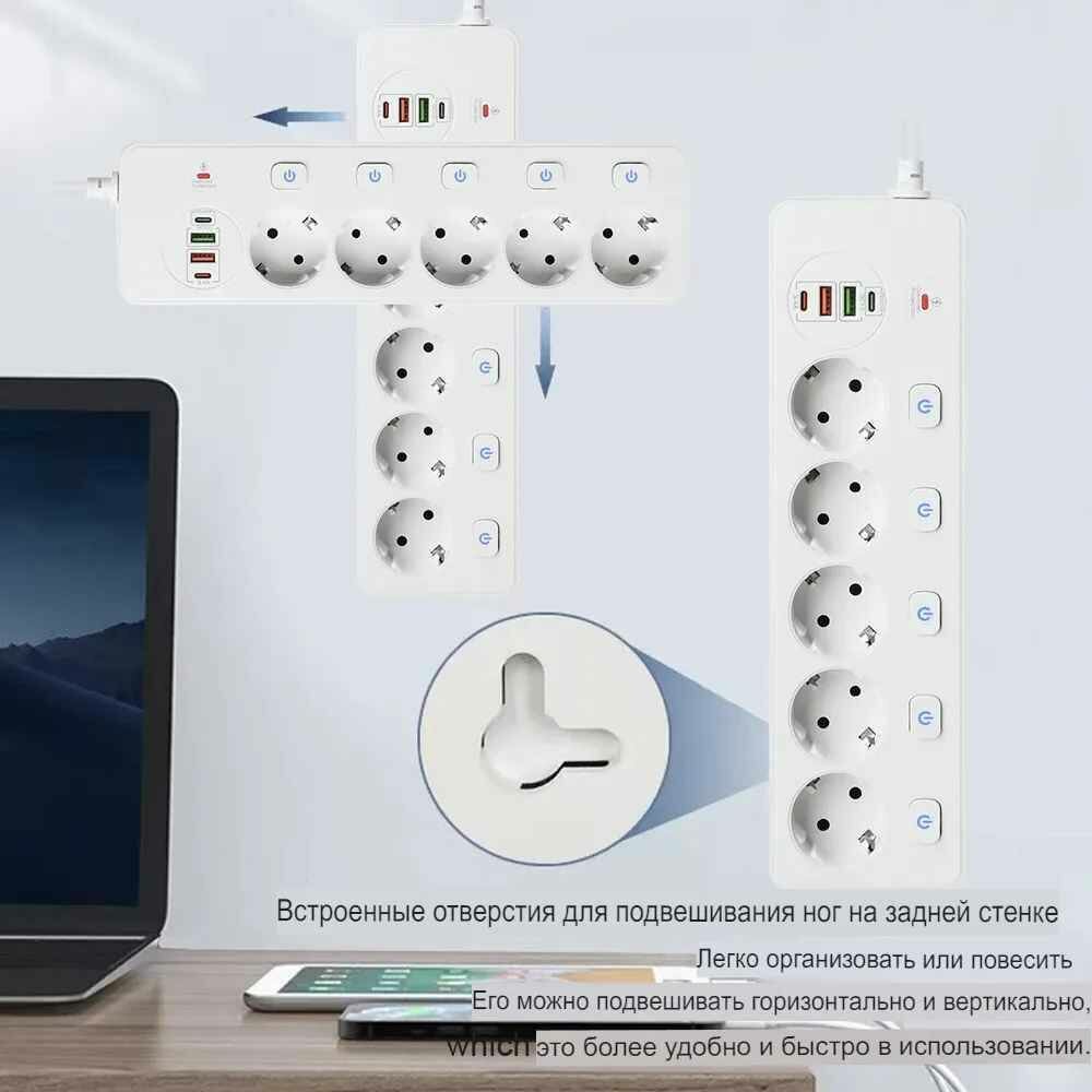 Сетевой фильтр, удлинитель с USB Type C портами, 2 метра кабель и 5 розеток, белый от GadFamily_Shop 1 505 ₽