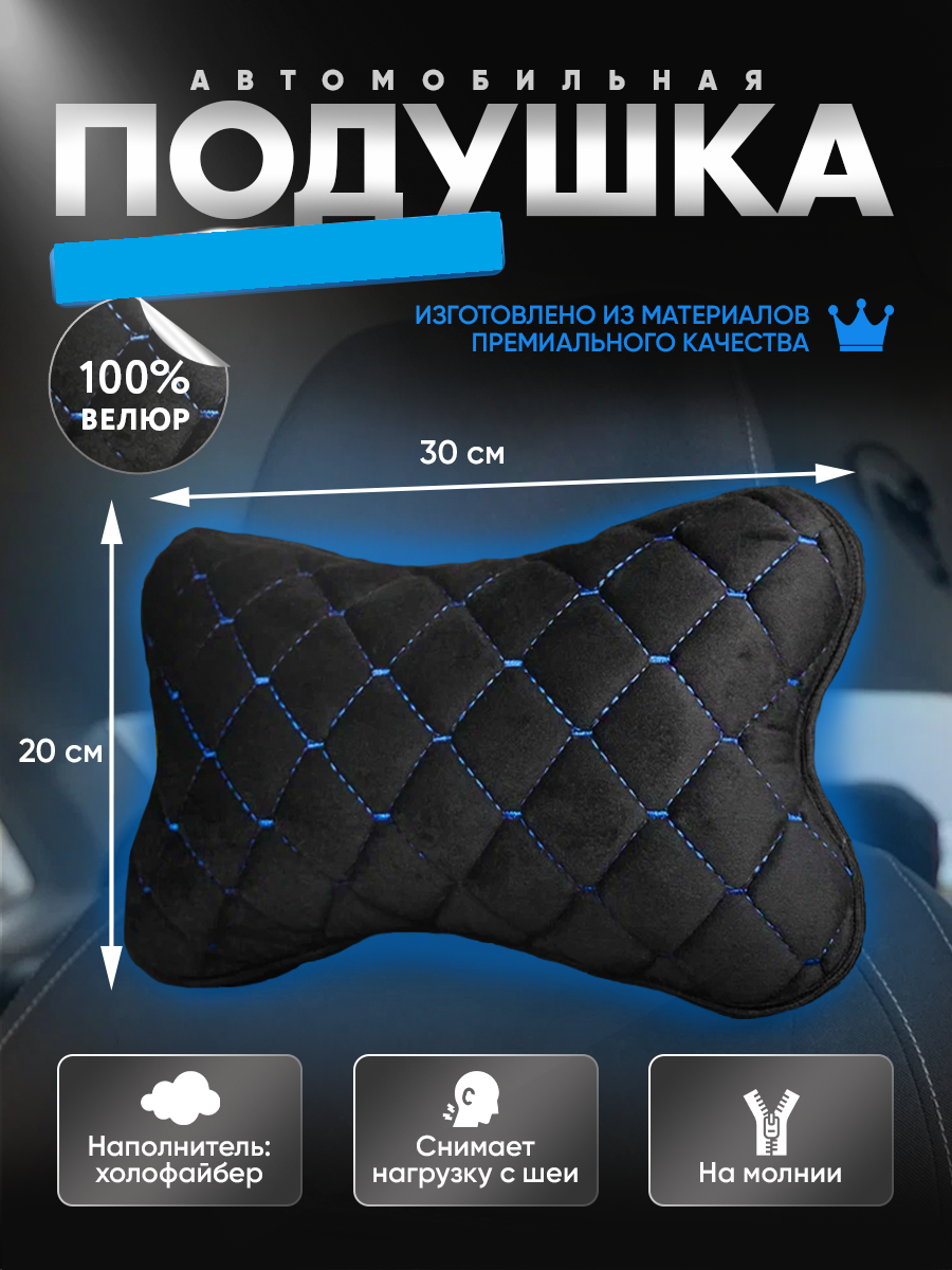 Автомобильная подушка на подголовник 1 штука из велюра с синей строчкой информация: