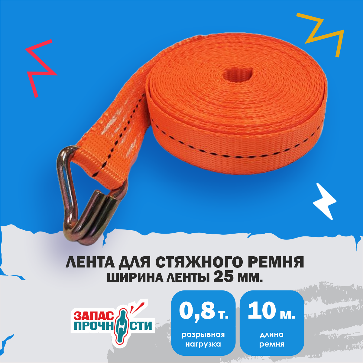 Лента для стяжного ремня с крюком 25мм 10м 0.8т информация: