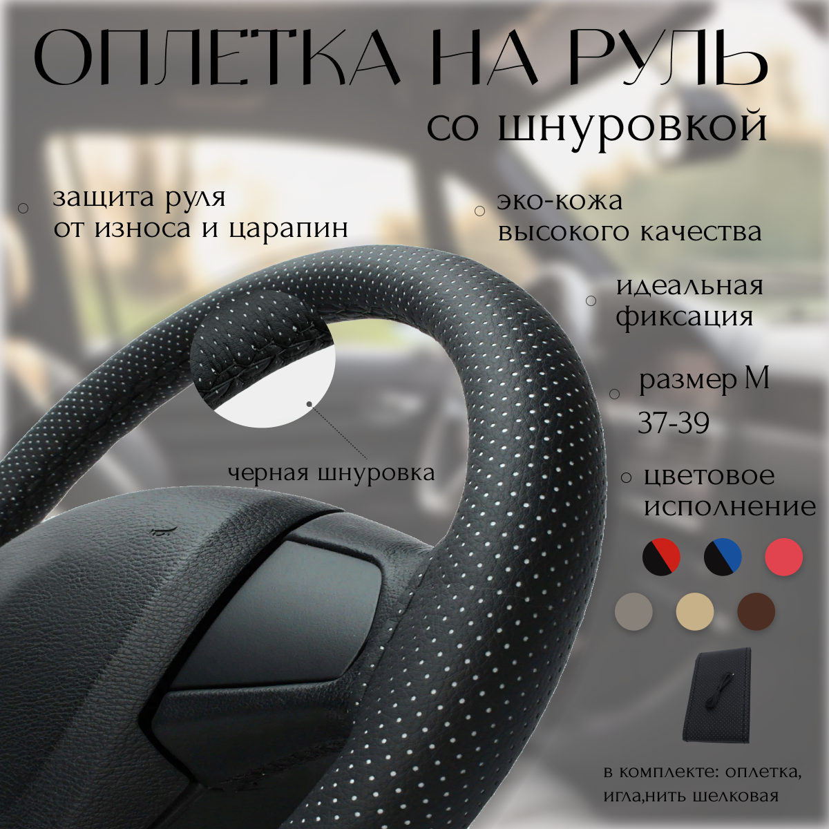 Оплетка на руль 37-39 см эко кожа со шнуровкой для автомобиля, чехол на руль универсальный (черная с черной нитью) 414 ₽