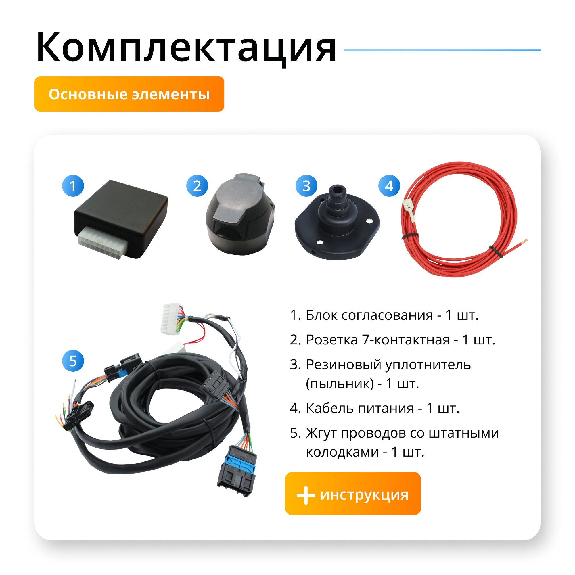 | Подробная комплектация | • Блок согласования -1шт. • Жгут проводов со штатными колодками. • Монтажный комплект -1шт. • Кабель питания-1шт. • Розетка 7-контактная с резиновым уплотнителем(пыльником)-1шт. • Инструкция -1шт. • Упаковочная коробка-1шт. |