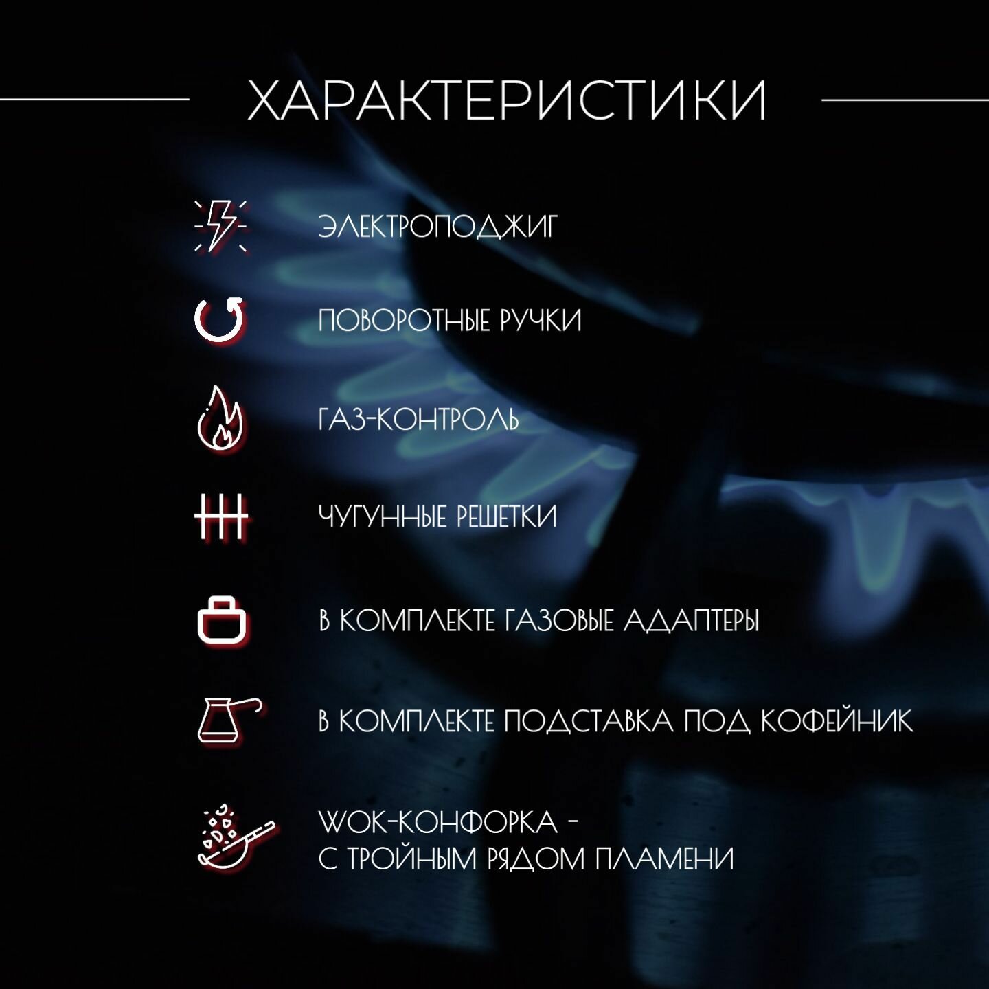 | Размеры конфорок | • 1 х 1.7 кВт • 1 х 0.9 кВт • 1 х 3.3 кВт (WOK – с тройным рядом пламени) |
